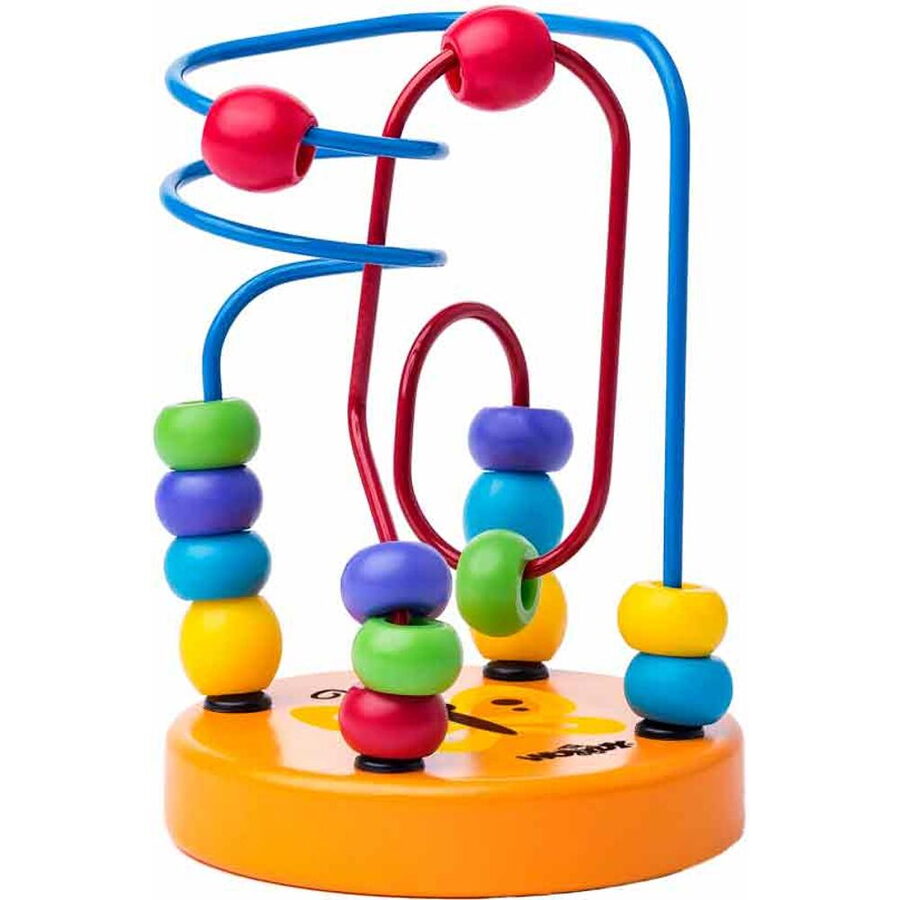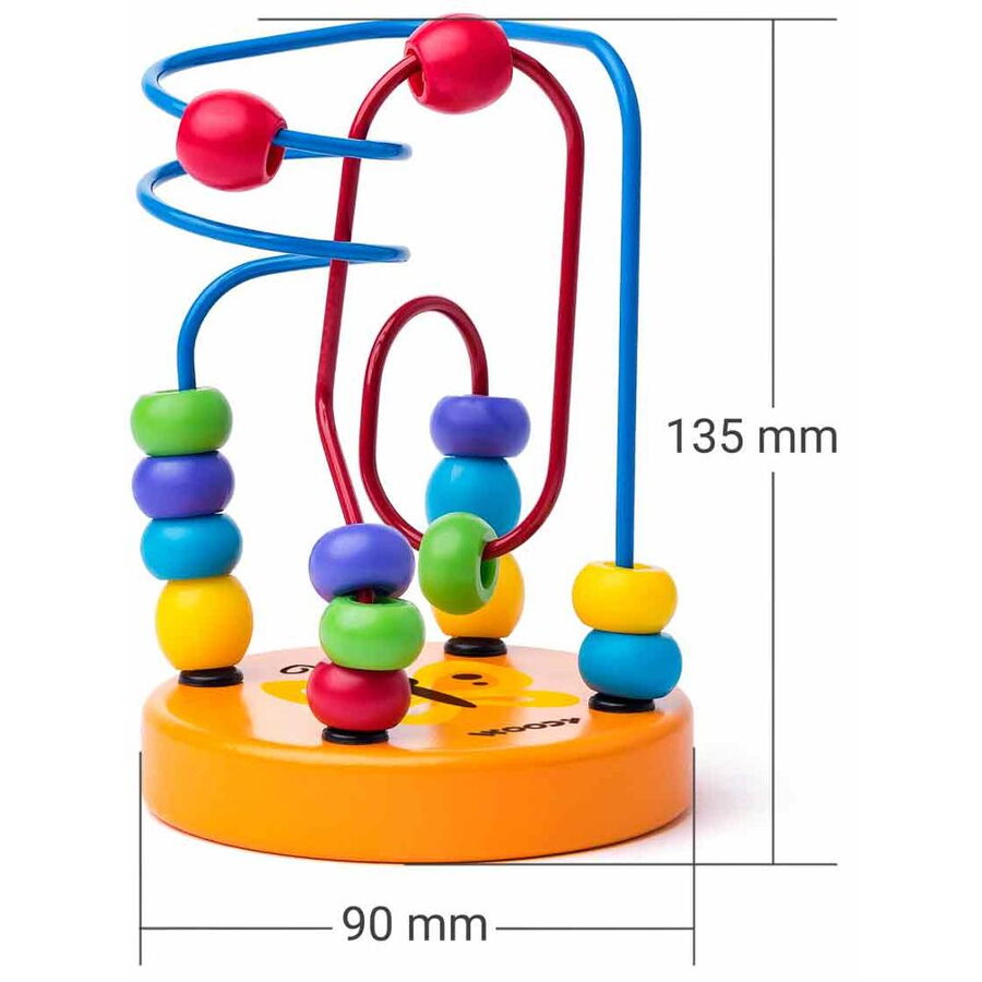 Dítě posouvá korálky navlečené na silné drátěné konstrukci
