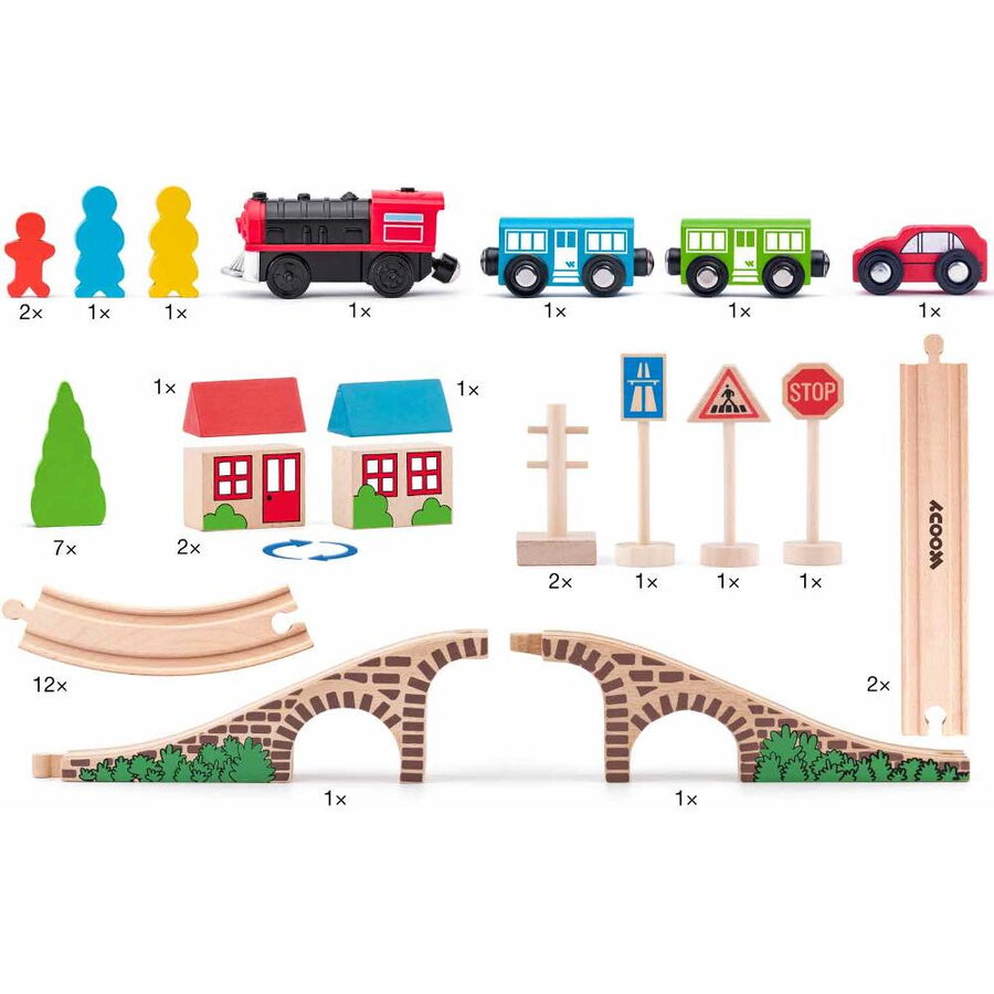 Obsahuje koleje, most, vlak se dvěma vagony, autíčko, značky, postavičky a stromy
