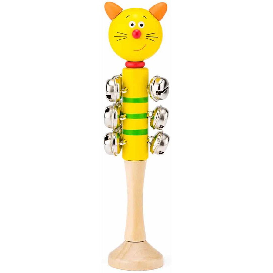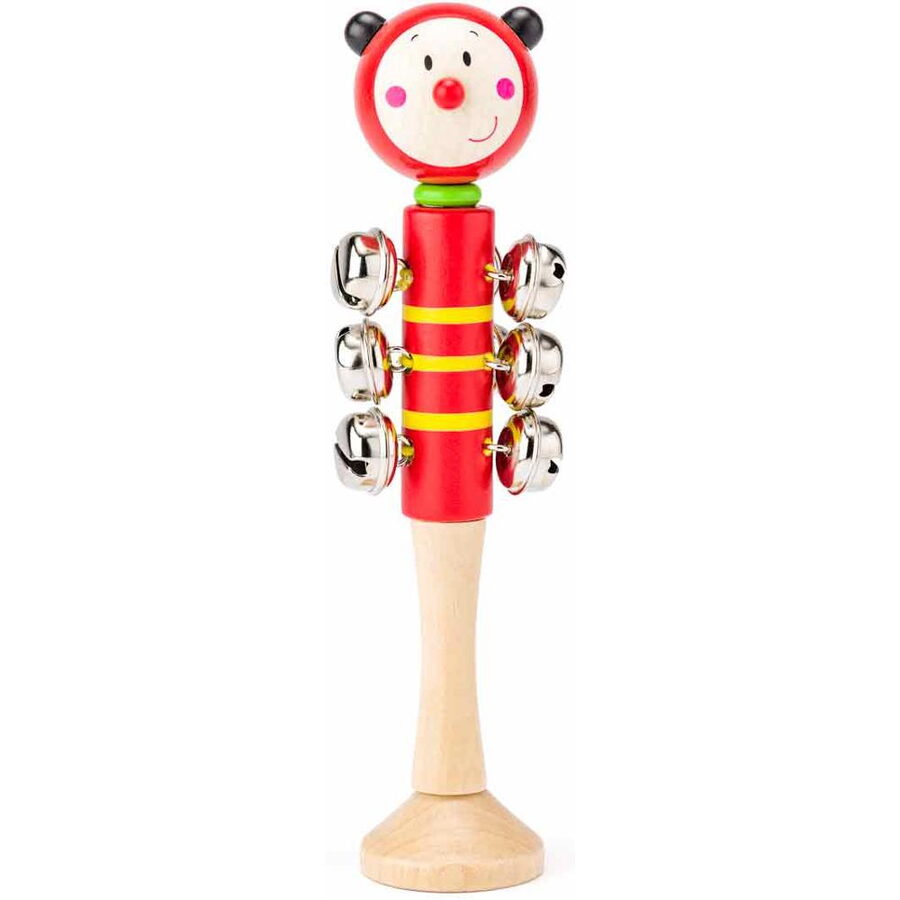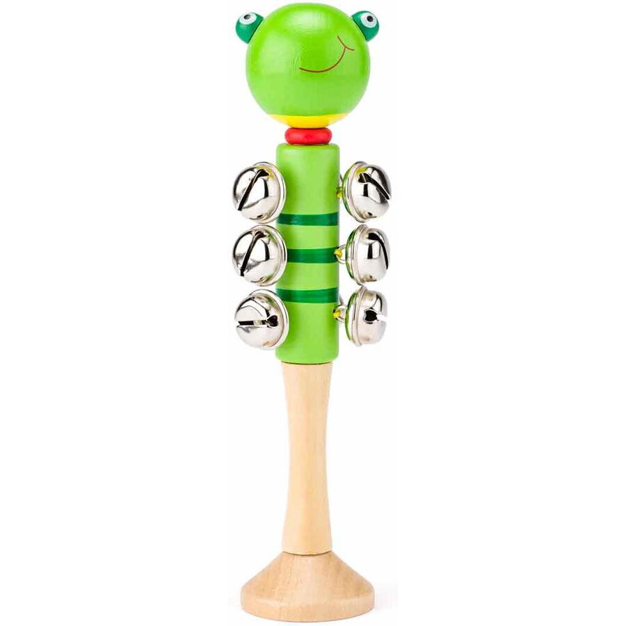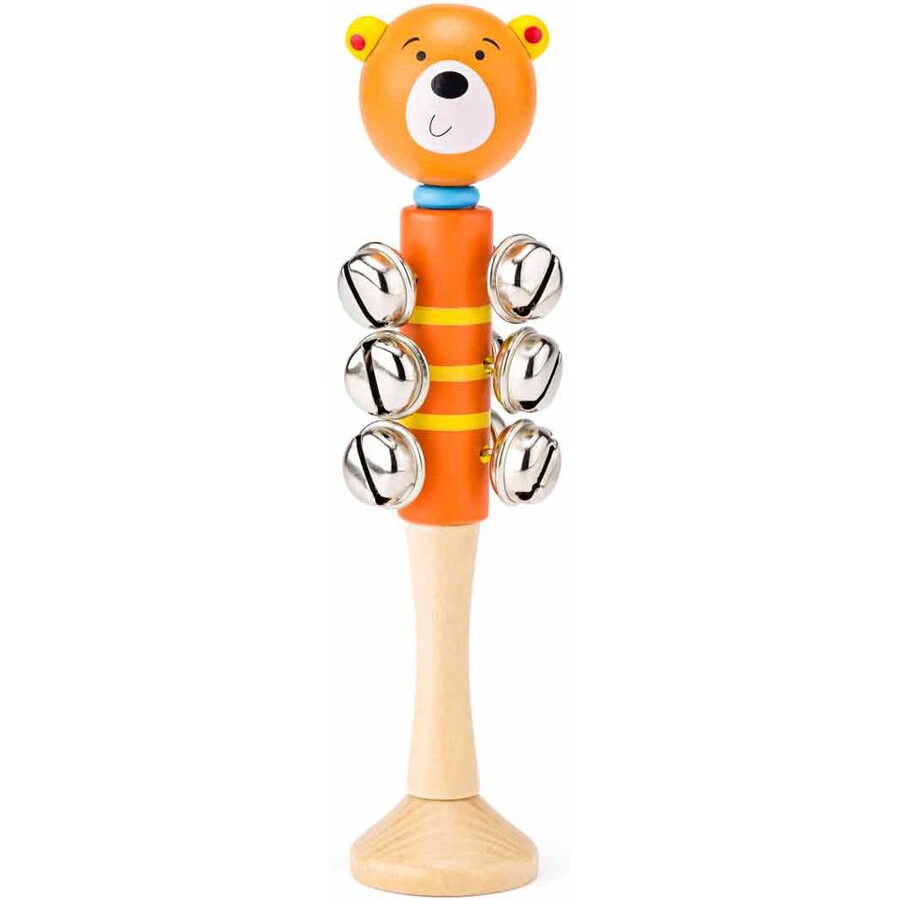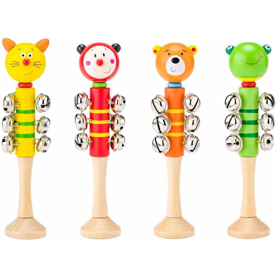 6 rolniček umístěných na dřevěné hůlce s hlavičkou zvířátka