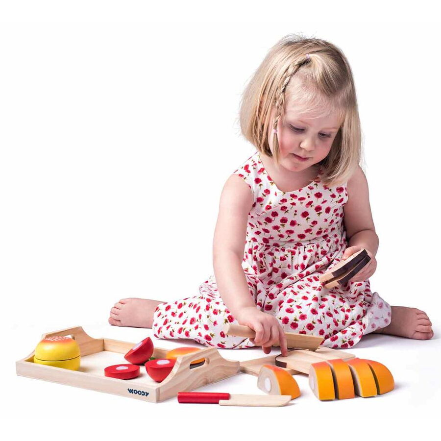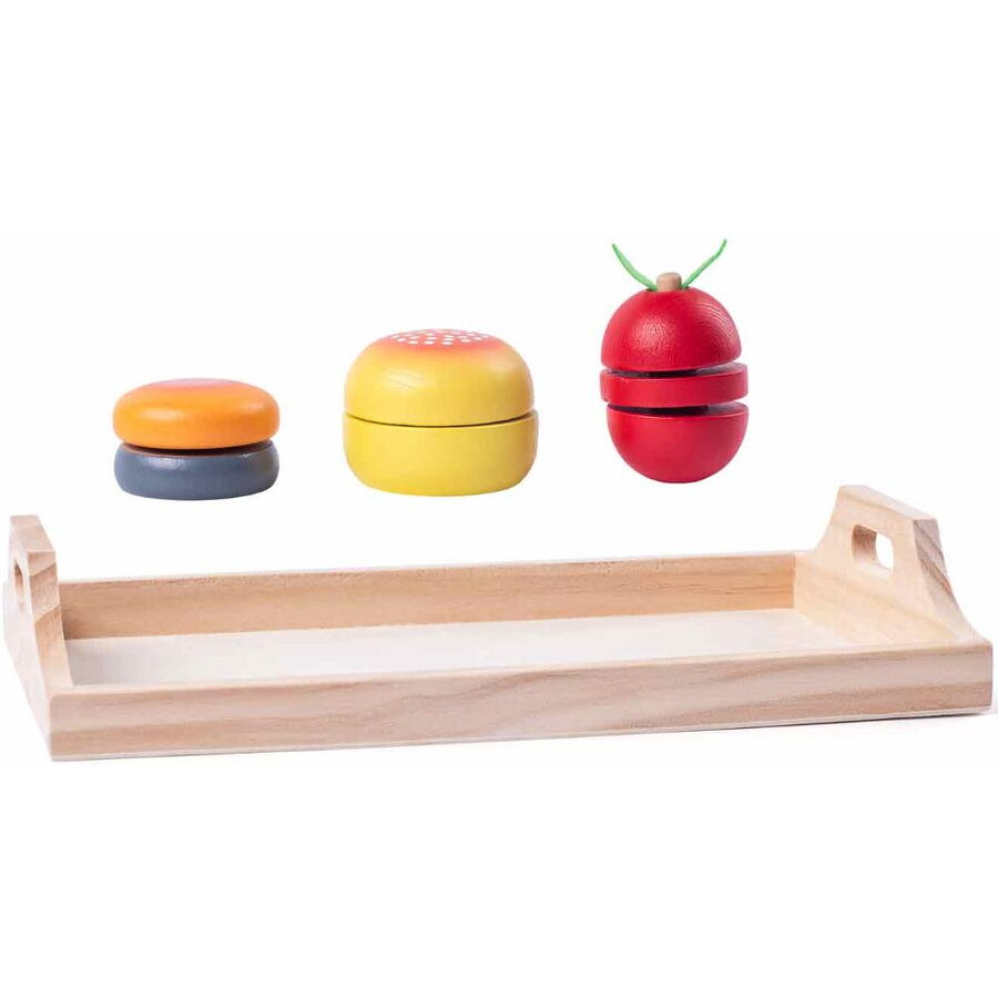 Všechny potraviny na dřevěném táce jsou složeny z částí spojených suchými zipy