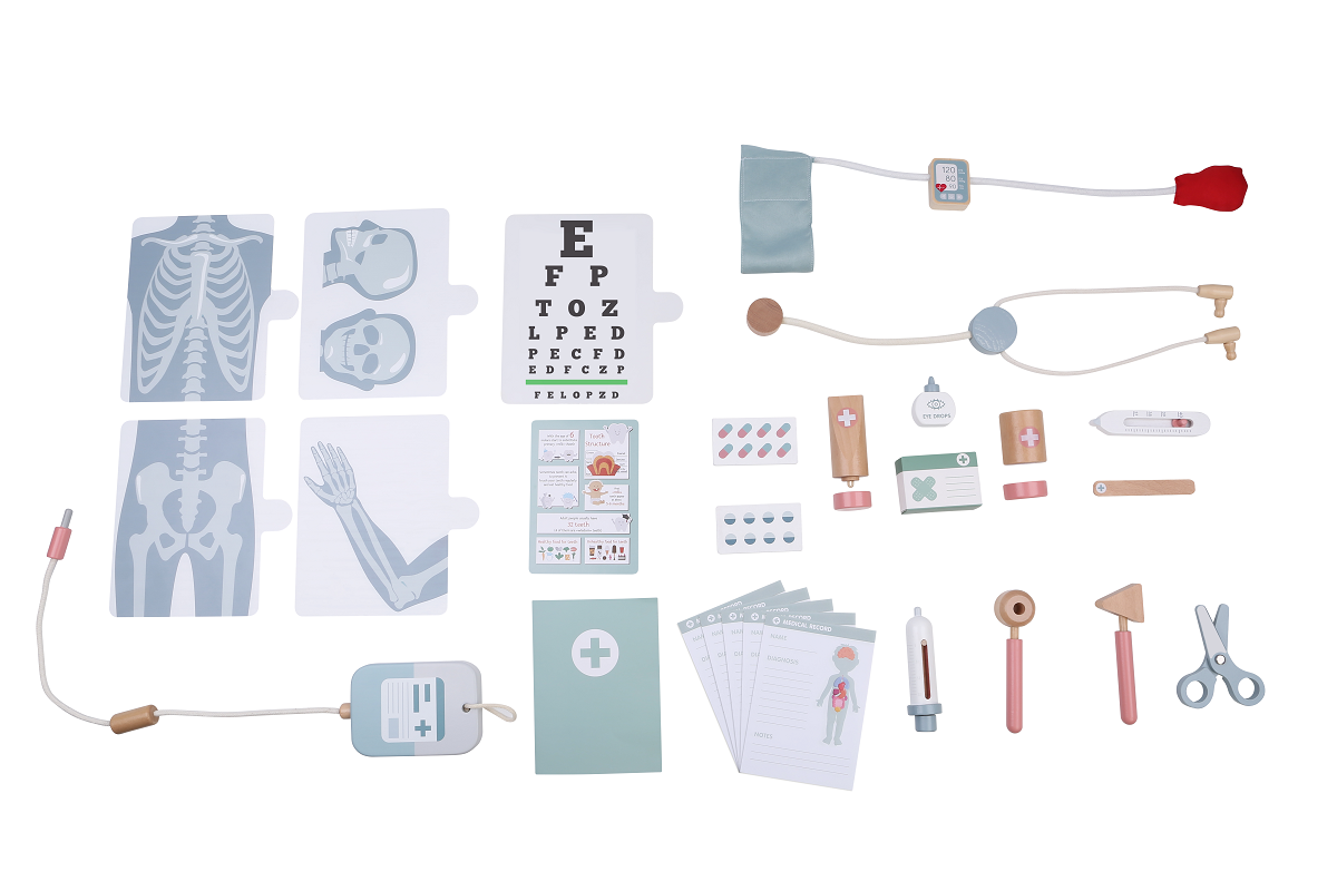 Hra s touto sadou je nejen skvělou zábavou, ale také učením. Děti se učí empatii, zbavení se strachu, zodpovědnosti i péči o druhé. Tato hračka podněcuje představivost, umožňuje objevovat tajemství povolání lékaře a učí rozpoznávat nástroje potřebné pro tuto práci. Hra navíc formuje manuální dovednosti. Znáte výšku svého pacienta? Ne? Pak ho změřte! Změřte mu i tlak nebo teplotu, poslechněte si ho a vše důkladně zapište do karty pacienta. Můžete také zkontrolovat zrak či sluch a nezapomeňte se podívat na rentgenové snímky na funkční podsvícené desce! Sada obsahuje stůl pro vyšetření a zákroky s úložným prostorem a nástroje nezbytné pro práci lékaře. Stetoskop, tlakoměr, teploměr, pinzetu, krabičky na léky a krémy, nůžky, infúzi, 4 RTG snímky, otoskop, injekční stříkačku, kladívko, karty pacientů, kartičky s léky, tabulku pro kontrolu zraku a informativní letáčky. Hlavní vlastnosti: obsahuje 30 ksdřevěná nemocnice s příslušenstvímpomáhá s rozvojem představivosti, řeči a sociálních dovednostízdokonaluje komunikační a motorické dovednostirozvíjí fantazii a kreativitufunkční deska k podsvícení RTG snímků - 2xAAA baterie není součástí balení