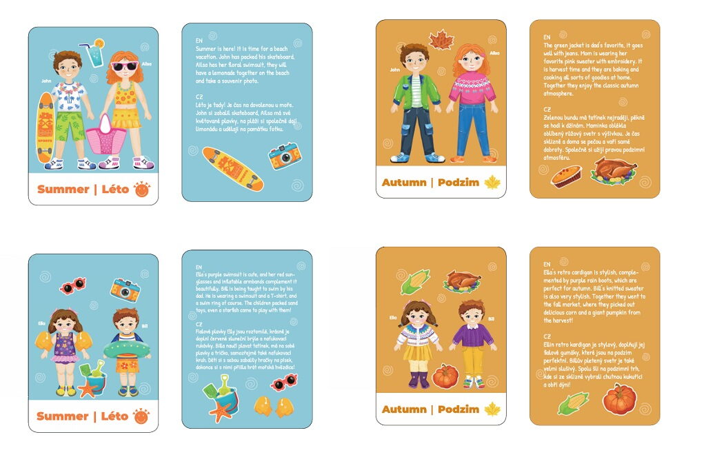 Oblékněte celou rodinu podle ročního období, nálady nebo zábavného úkolu! Magnetická sada „Happy Family“ přináší spoustu kreativní zábavy při navrhování oblečků pro maminku, tatínka, holčičku i chlapečka. Každý člen rodiny má své magnetické oblečky, doplňky a jedinečný styl – a záleží jen na dětské fantazii, jak je oblékne.Součástí sady jsou i tematické kartičky, které děti inspirují ke konkrétním úkolům – např. oblečení na léto či podzim, výlet na pláž, pečení dýňového koláče nebo podzimní sklizeň či zimní radovánky. Děti se tak hravě učí o ročních obdobích, rozvíjejí představivost a zároveň si procvičují jemnou motoriku. Hlavní vlastnosti: dřevěná magnetická krabička s otočnou tabulí4 postavy k oblékání (maminka, tatínek, dcera, syn)více než 80 magnetických dílků oblečení a doplňků8 oboustranných kartiček s příběhy v češtině a angličtině (jaro, léto atd.)rozvíjí jemnou motoriku, fantazii a poznávání ročních obdobípro děti od 3 letideální pro hru doma i na cestách