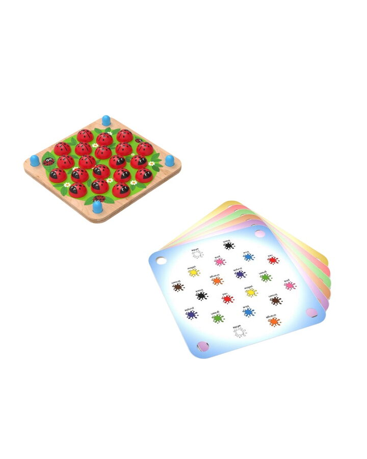 Pexeso, které učí i baví!Tato netradiční vzdělávací hra zaujme děti i dospělé hravou formou, která rozvíjí paměť, soustředění a pozorovací schopnosti. Na rozdíl od klasického pexesa děti neobracejí papírové kartičky, ale používají dřevěné berušky, které lépe padnou do malých dětských ručiček.Stačí mezi dvě dřevěné desky vložit jednu ze šesti tematických předloh, zakrýt obrázky beruškami a zábavná hra může začít. Děti si při ní procvičí nejen paměť, ale také jemnou motoriku, logické myšlení a rozšíří si slovní zásobu. Hra je ideální pro samostatné hraní i společné chvíle s rodinou. Hra obsahuje 6 tematických karet. Na jedné kartě je ovoce, na druhé geometrické tvary, na třetí domácí zvířata, na čtvrté zvířátka ze zoo, pátá karta je s dopravními prostředky a poslední, šestá karta, má na sobě barevné skvrny s anglickými názvy barev. Všechny karty jsou oboustranné. Pravidla hry: Vyberte si jednu z hracích karet. Zasuňte kartu mezi 2 dřevěné desky. Umístěte na obrázky přiložené berušky. Hra pokračuje jako klasické pexeso – hráč v každém kole obrací dvě berušky a hledá shodné dvojice. Vyhrává ten, kdo najde nejvíce dvojic. Hlavní vlastnosti: 2dílná dřevěná hrací deska, 6 tematických hracích karet, 20 dřevěných berušekrozvoj koordinace ruka–okopodpora manuálních dovedností a obratnostitrénink logického myšlenísenzorická stimulace rozvoj kognitivních schopností a koncentracerobustní a odolné provedení z kvalitního dřeva