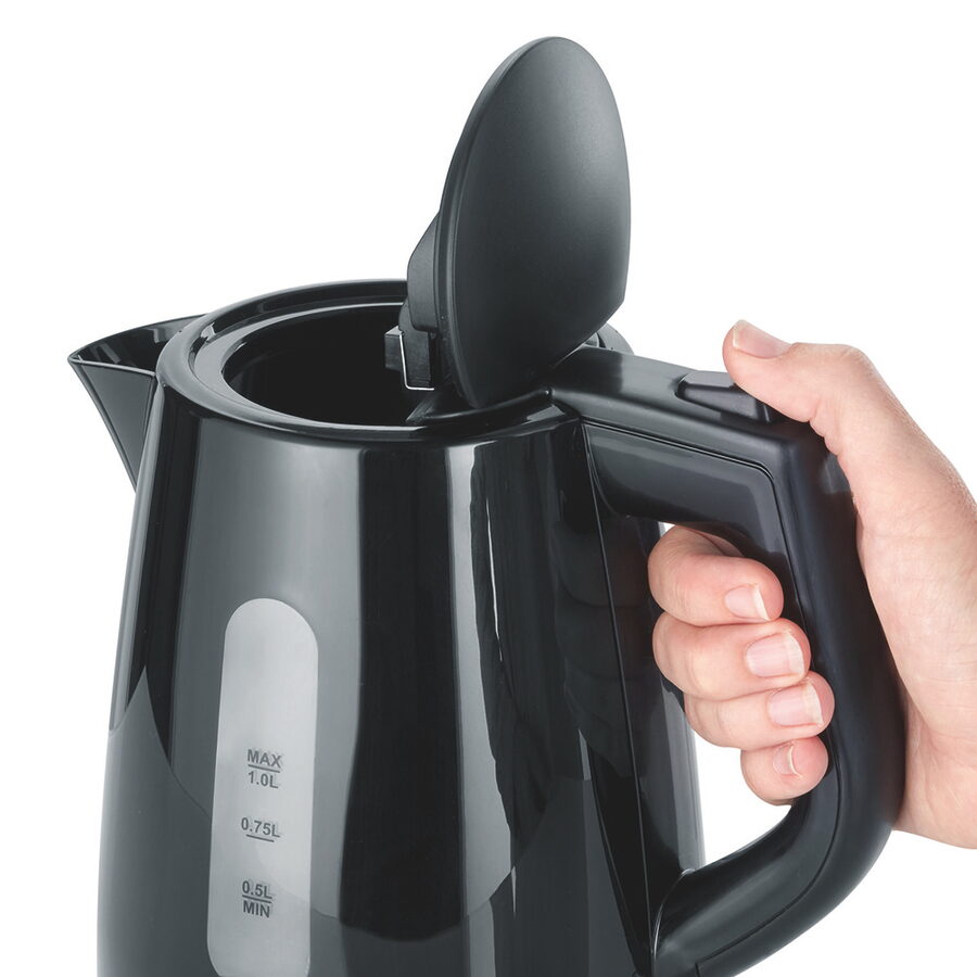 Kompaktní a výkonná černá rychlovarná konvice• Oboustranný indikátor hladiny vody pro snadné čtení úrovně plnění• Praktická obsluha jednou rukou• Odnímatelný, omyvatelný filtr• 360° centrální bezdrátový systém: může být připojen k základně zařízení z libovolného směru• Skryté topné těleso z nerezové oceli• Příkon:. 2200 W• Objem: 1,0 l• Barva: černá• Ochrana proti přehřátí• Spínač zapnutí a vypnutí s kontrolkou• Tepelně izolovaná plastová rukojeť• Protiskluzové gumové nohy• Úložný prostor pro šňůru• Originál bezpečný STRIX středový konektor