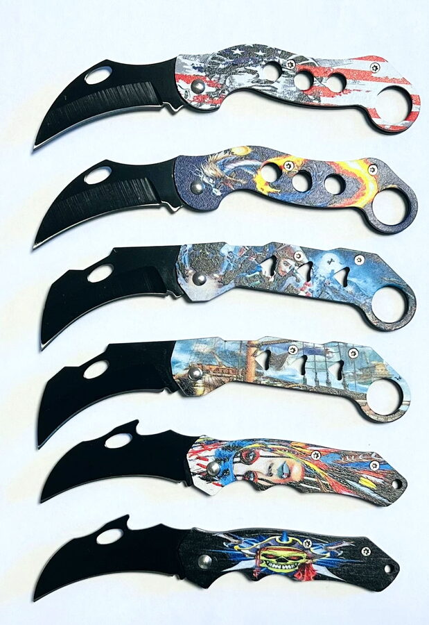 (BAL:1/12) Outdoor přenosný nůž , celokovové provedení, zahnutá čepel.6 druhů designů. Rozměr: 150-155mm x 24mm x 8mm.Různé motivy, např. kmenový, námořní, pirátský, americký.Prodejní obal: blistr. Není vhodný pro děti do 18 let. Cena za 1ks.