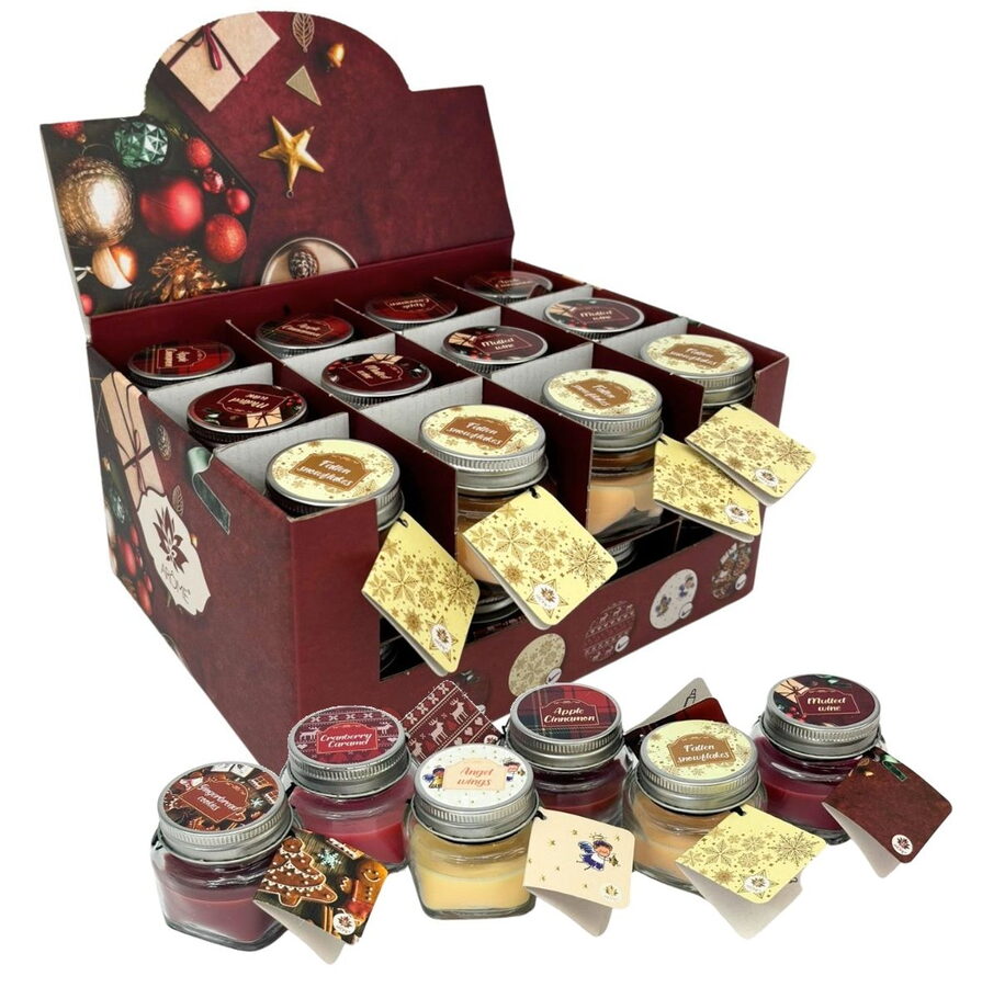 (BAL:24/48ks) Vánoční svíčka vosková ve skle s přáním 28g Winter 0341. Vůně: mix 6 ovocných vůní - andělská křídla, svařené víno, perník, jablko a skořice, brusinka a karamel, padající vločka.Vonná svíčka ve skleněné dóze s víčkem vám doma vykouzlí příjemnou atmosféru a nádherně provoní interiér. Plamínek svíčky je ideální pro vaši pohodu v podzimních a zimních měsících. Svíčky mají cedulku, kam je možné napsat osobní vzkaz. I proto je svíčka vhodná jako dárek.Motiv: vánoční, dárkový. Materiál: parafín. Doba hoření: 8-10 hodin. Rozměr: průměr 5,7 x 5,2cm. Rozměr boxu: 23,5 x 17,5 x 11,5cm.Prodej po 24ks v boxu.Cena za jeden kus.