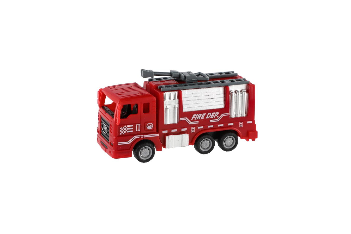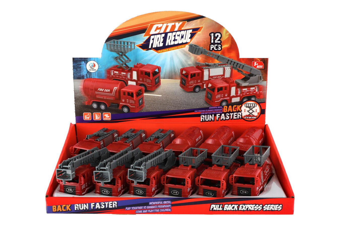 Auto hasiči plast 11cm na zpětné natažení 4 druhy 12ks v boxu