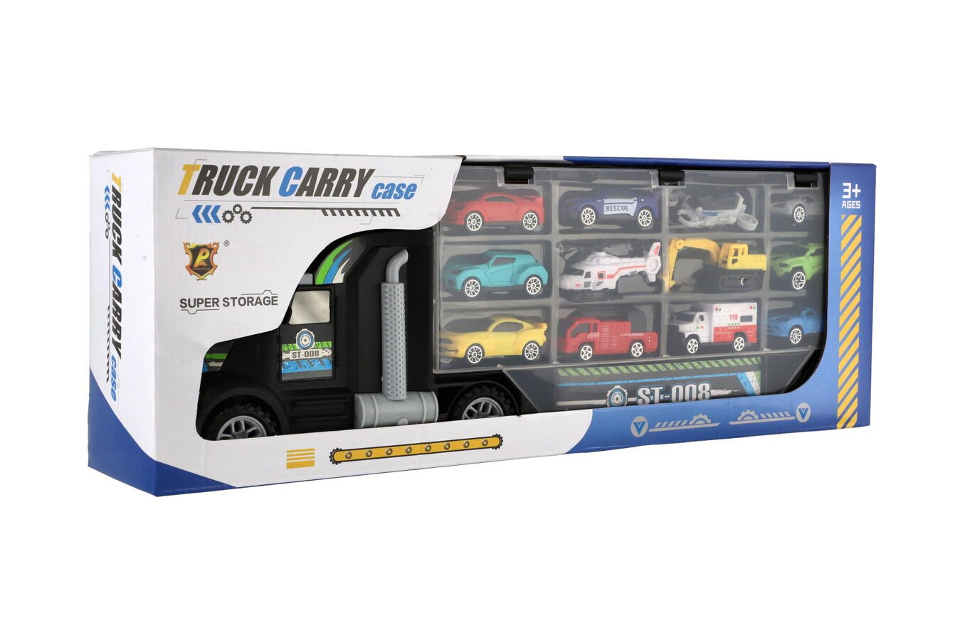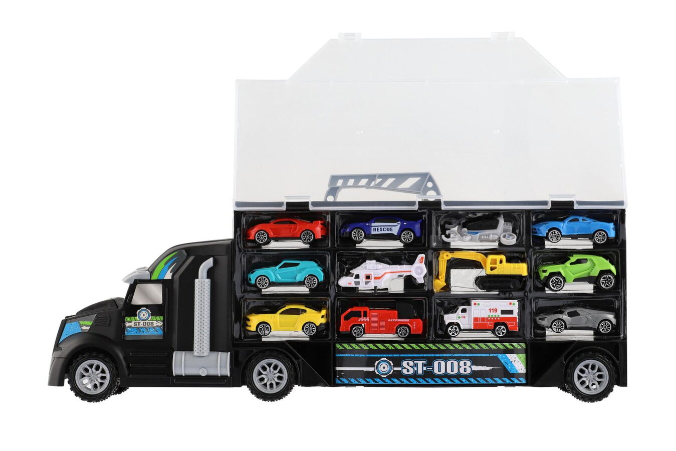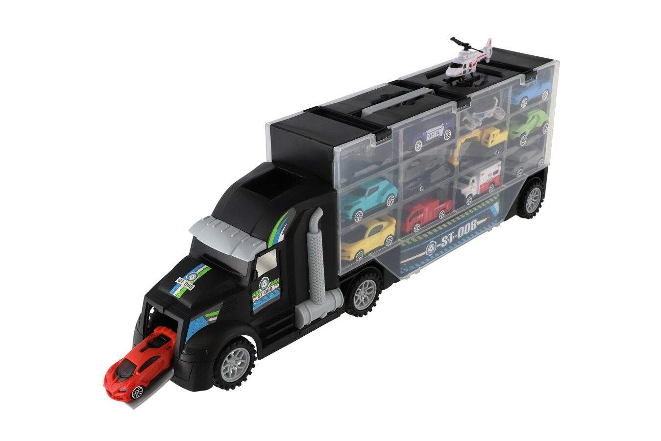 Velký kamion přepravník s volným chodem potěší všechny malé milovníky aut! Kamion slouží jako úložný box a zároveň jako herní set – uvnitř se ukrývá prostor pro uložení mnoha dopravních prostředků, které lze snadno převážet i vystavovat. Přední i zadní rampa umožňuje pohodlný vjezd i výjezd autíček, a díky madlu lze kamion jednoduše přenášet. Nechybí ani přistávací plocha pro vrtulník – ideální hračka na cesty i na doma!
