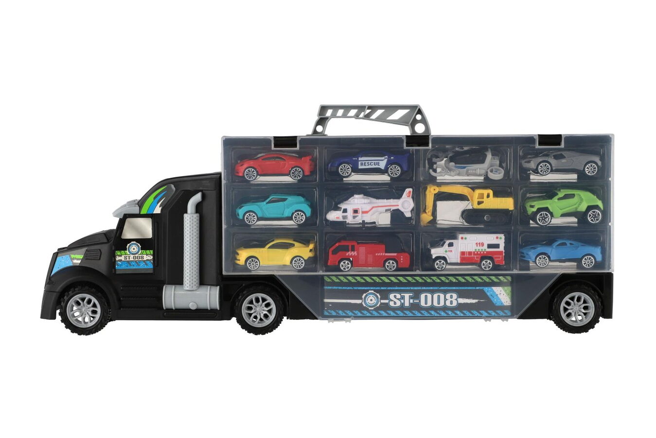 Auto kamion přepravník + dopravní prostředky plast 50cm na volný chod v krabici 51x18x10cm