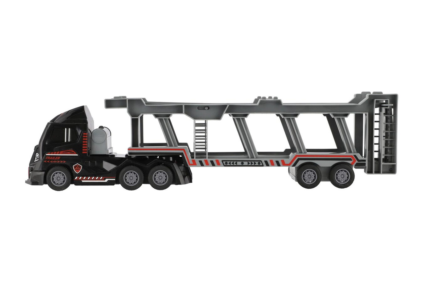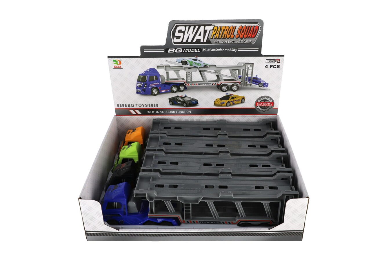 Vydej se na policejní zásah s parádním kamionem přepravníkem! Tento velký plastový tahač s realistickým designem a pohonem na setrvačník přepravuje tři různá policejní autíčka, která lze snadno vyjímat a znovu nakládat díky funkční rampě. Dvoupatrový návěs je výklopný a zajišťuje skvělou hratelnost i prostor pro uložení vozidel.