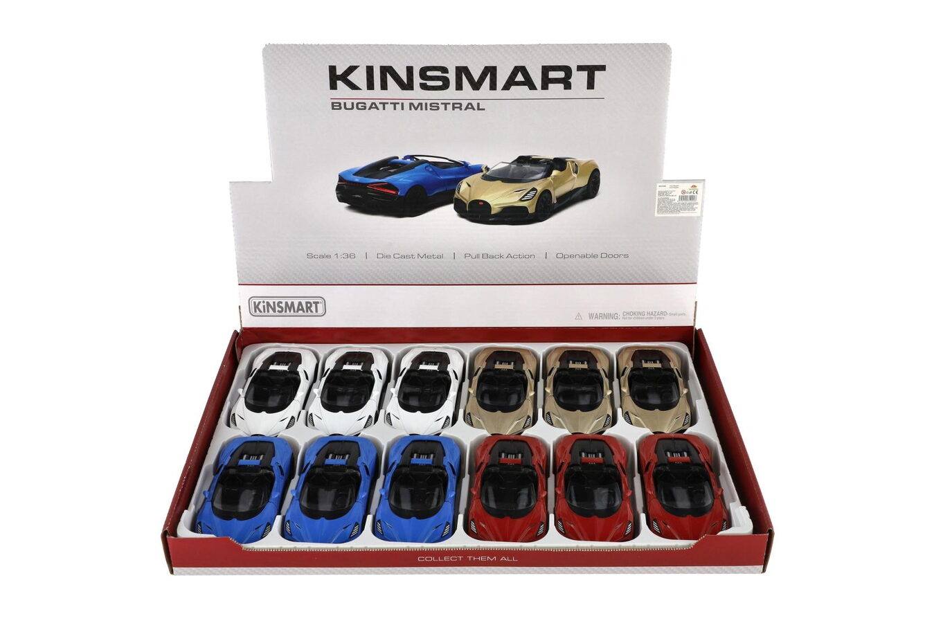 Auto Kinsmart Bugatti Mistral kov/plast 13cm na zpětné natažení 4 barvy 12ks v boxu