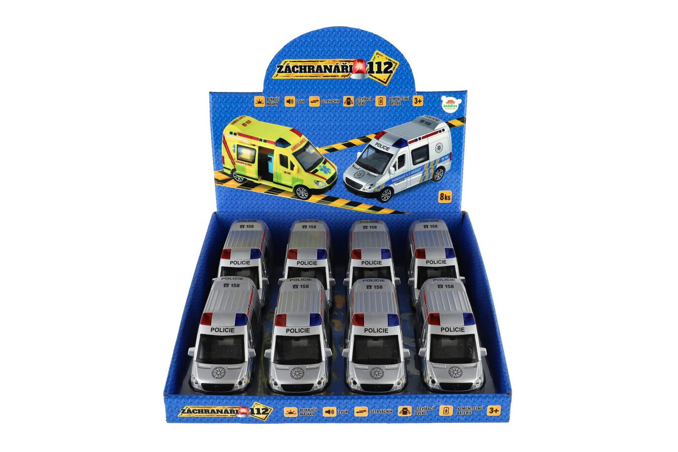 Auto policie plast 15cm na baterie se zvukem se světlem na setrvačník 8ks v boxu