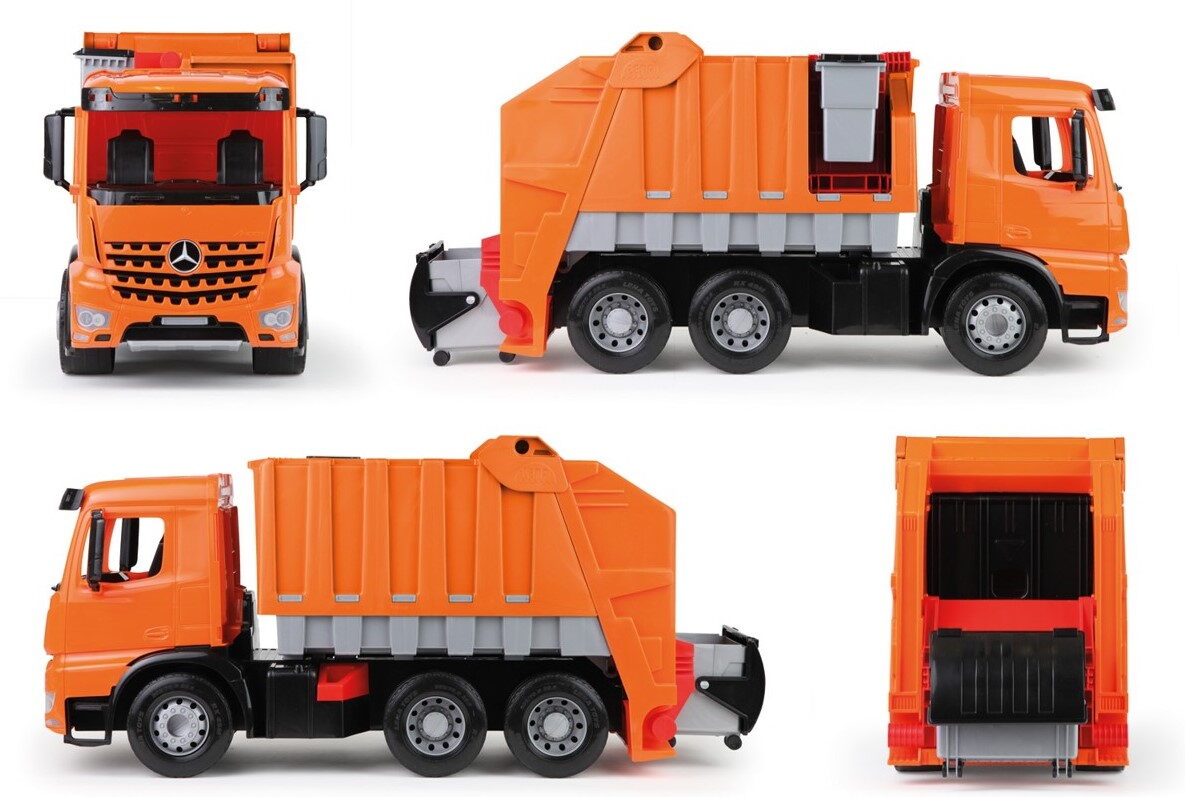 Plně multifunkční popelářské auto Mercedes Arocs s odnímatelnou popelnicí a kontejnerem na kolečkách. Vyroben z kvalitního plastu. Lze použít jako odrážedlo.