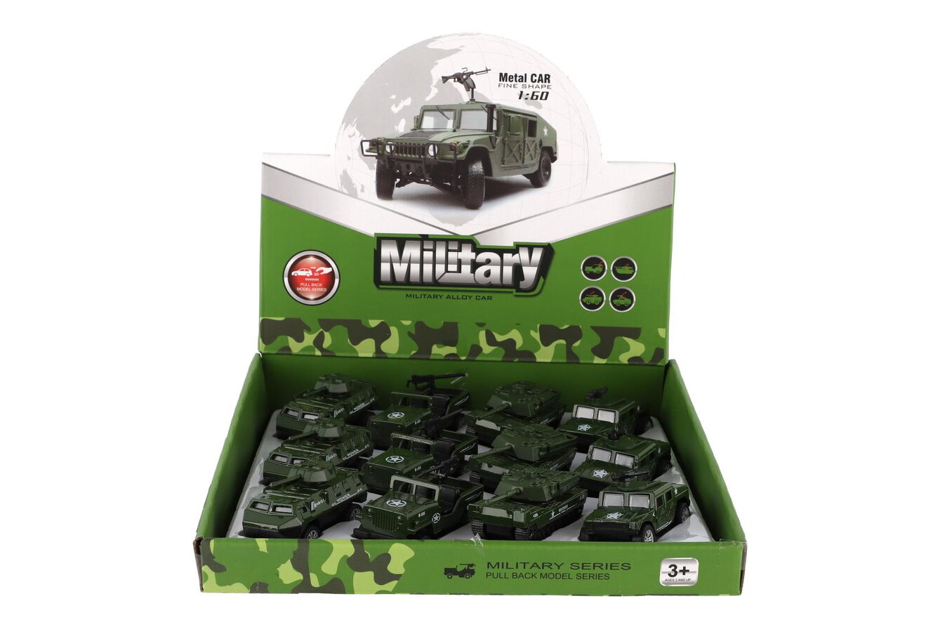 Auto vojenské mini kov/plast 7-8cm na zpětné natažení 4 druhy 12 ks v boxu