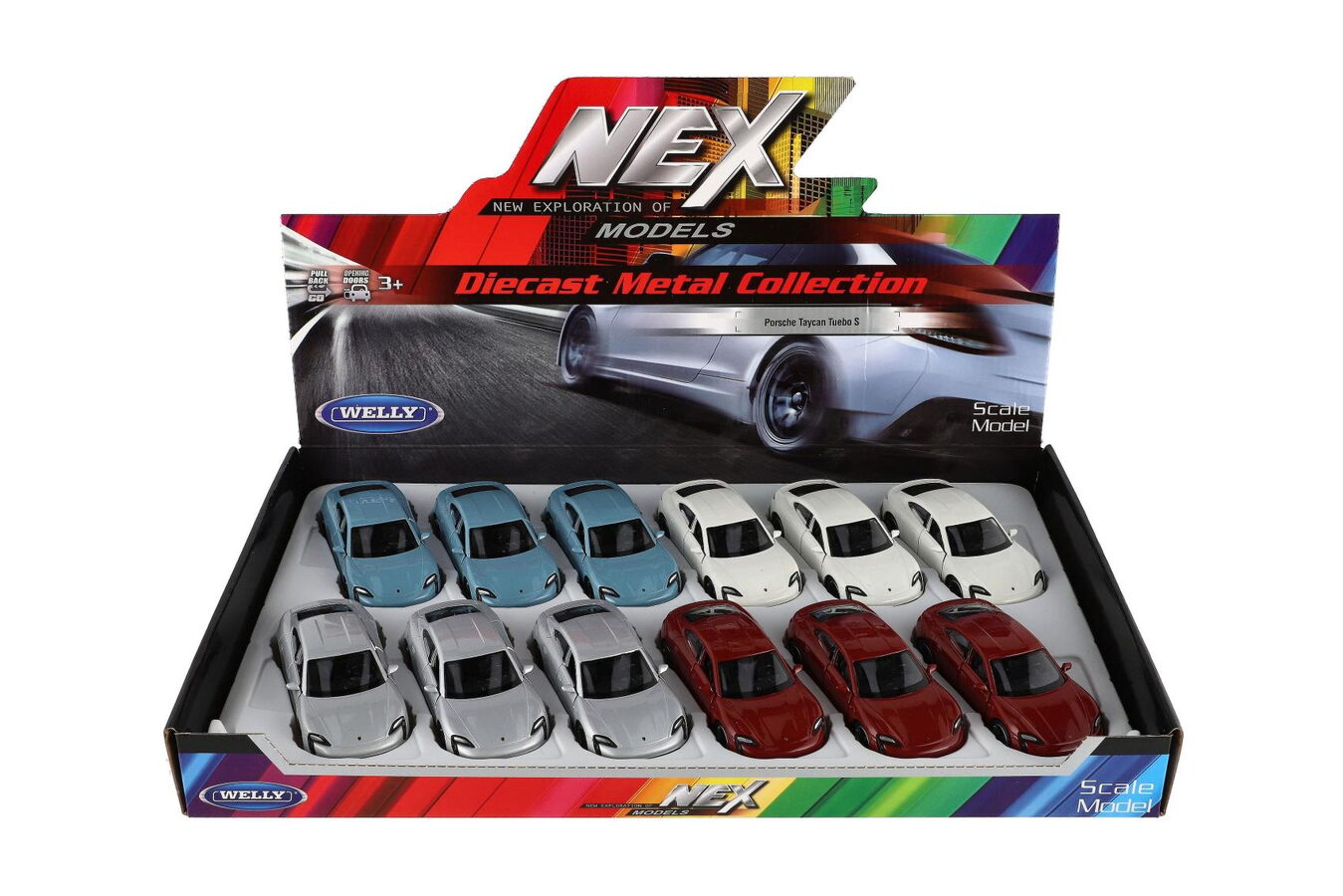 Auto Welly Porsche Taycan Turbo S kov/plast 12cm 4 barvy na zpětné natažení 12ks v boxu
