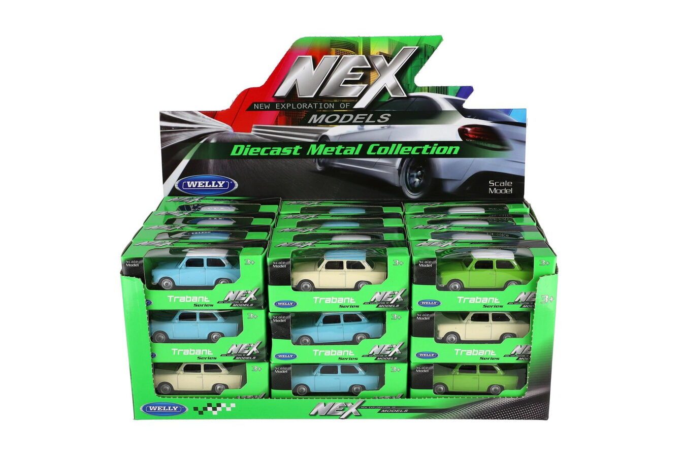 Auto Welly Trabant 1:60 kov 7cm asst mix barev volný chod v krabičce 36ks v boxu