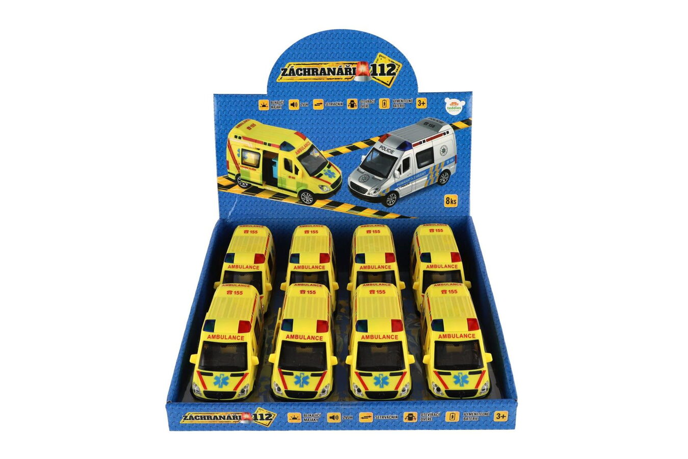 Auto záchranáři, ambulance plast 14,5cm na baterie se světlem, zvukem na setrvačník 8ks box