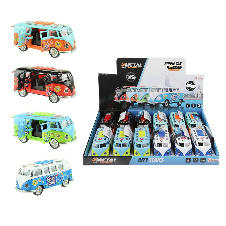 Autobus retro kov/plast 12cm na baterie se zvukem se světlem na zpětné natažení 4 barvy 12ks v boxu
