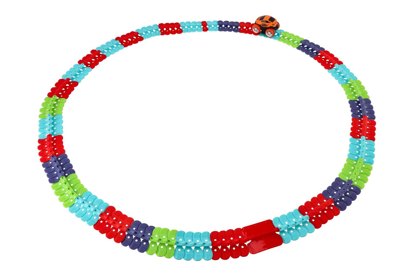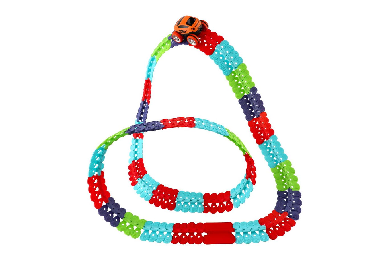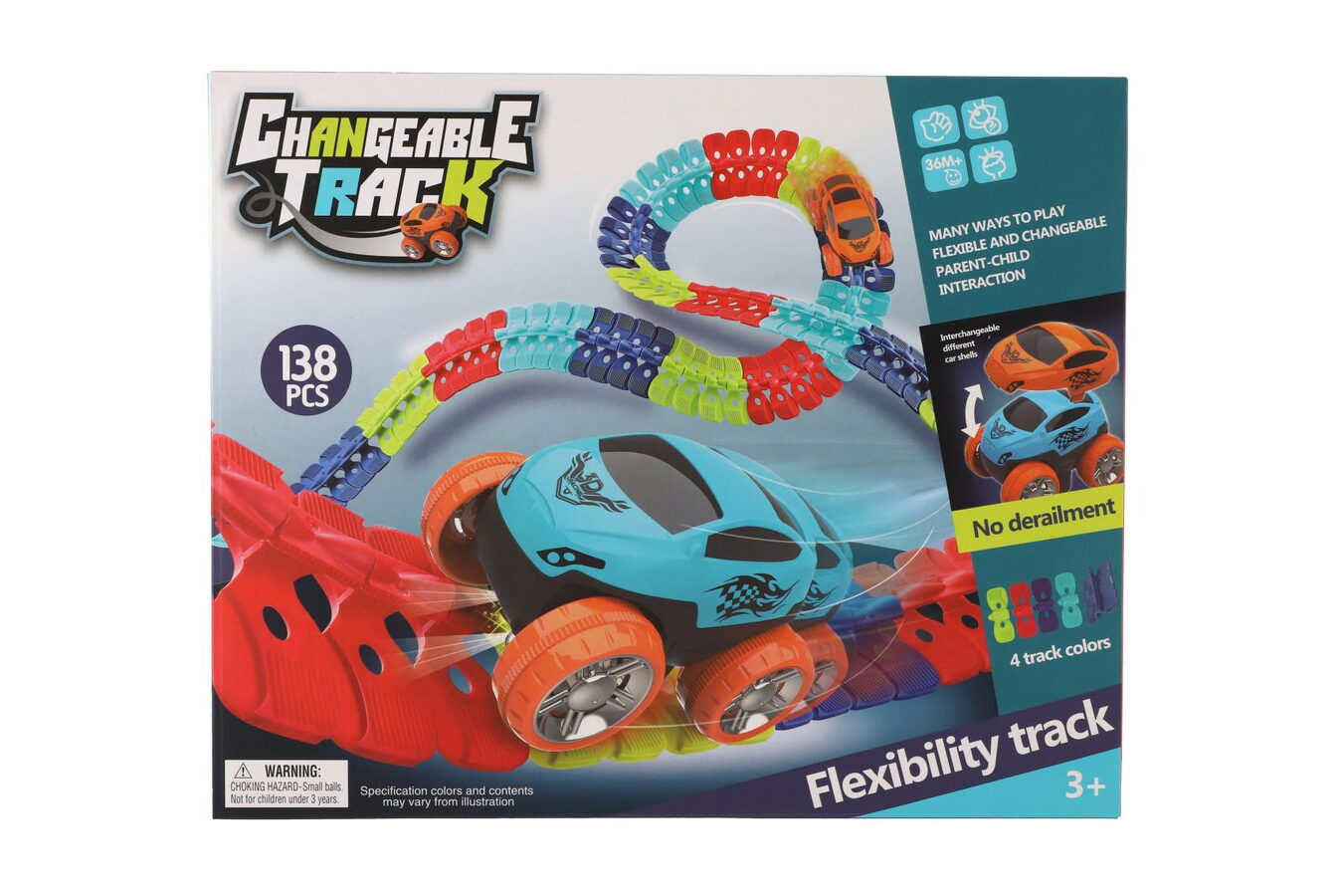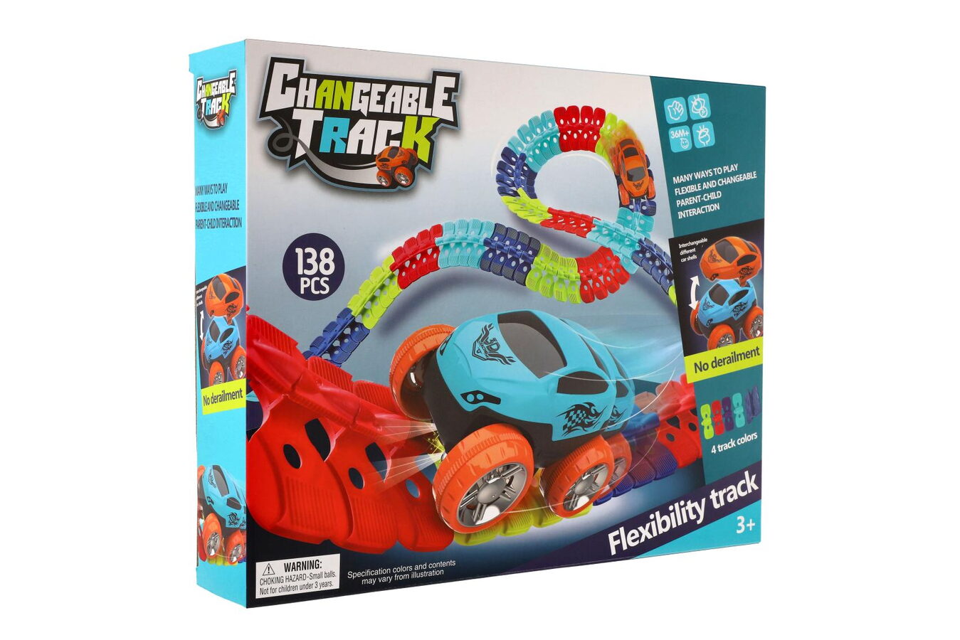 Jedinečná závodní dráha, která je vyrobena z flexibilních dílů, dají se jednoduše pospojovat do jakékoliv barevné kombinace a umožňují dráhu ohýbat a otáčet. V balení najdete autíčko, které svítí a jezdí po dráze. Autíčko má oddělitelnou kabinu, můžete tak mít chvíli oranžové auto a chvíli modré auto. Na baterie 3x AAA, které nejsou součástí. Balení obsahuje 138 ks + auto.