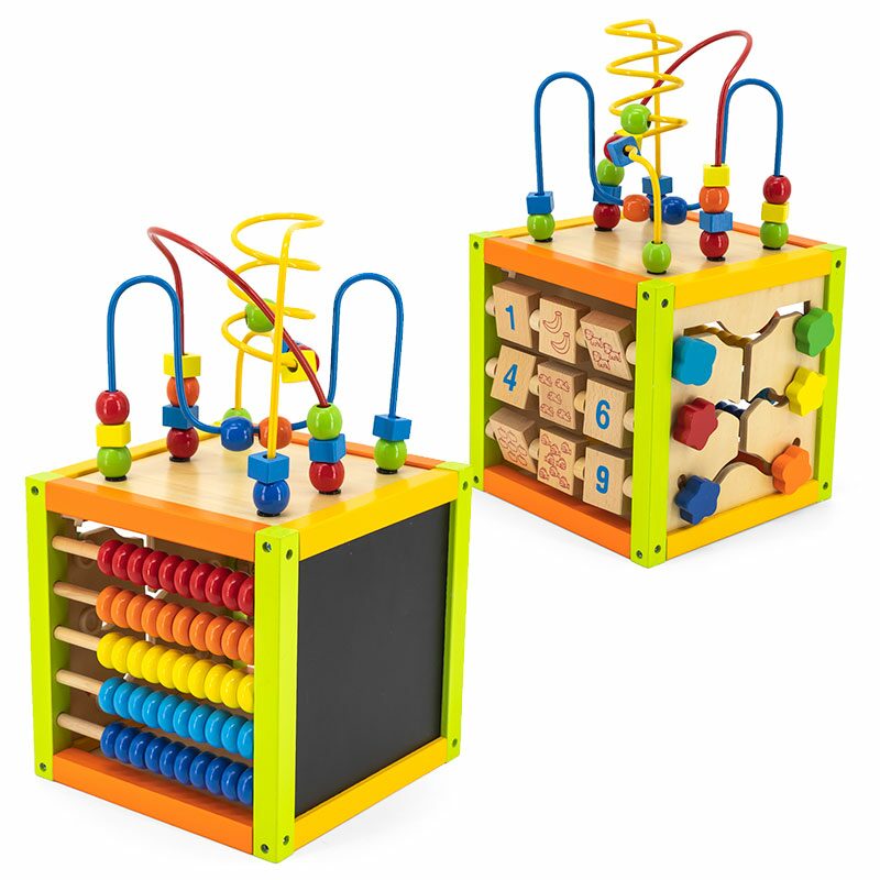 Dřevěná kostka s mnoha funkcemi, počítej, hraj si s labyrintem, posouvej, poznávej barvy, tvary ...