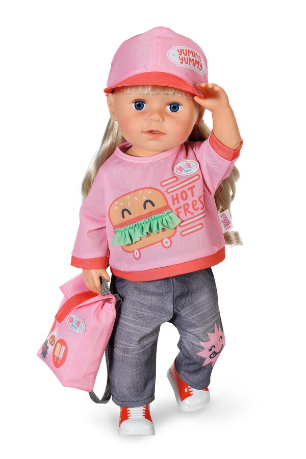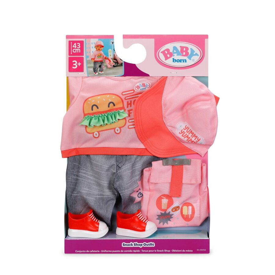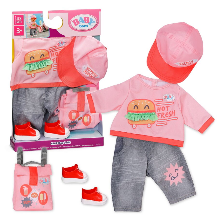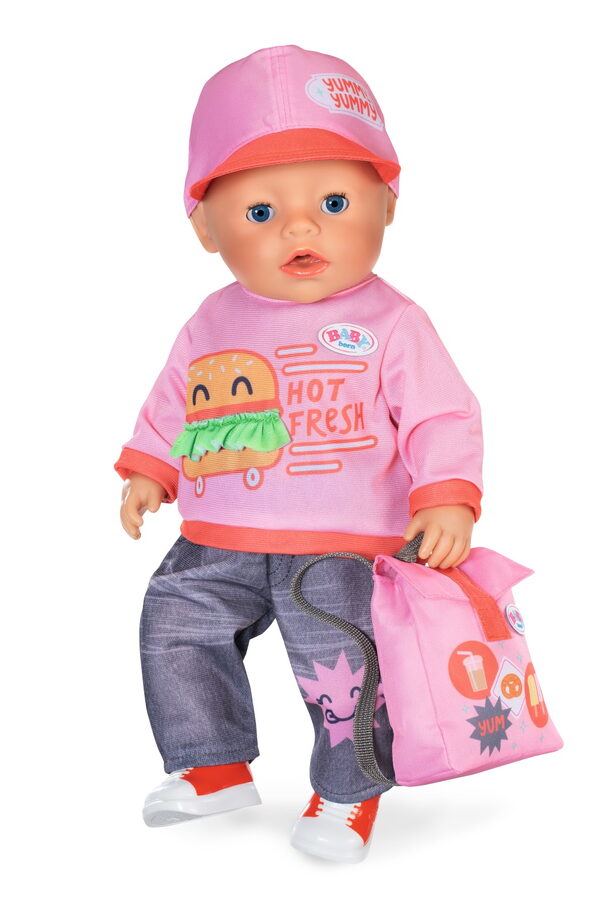Outfit k vozíku s občerstvením obsahuje tričko s potiskem burgeru, pohodlné džíny, boty, stylovou kšiltovku i batoh s dostatkem místa na rozvoz jídla a svačinek. • Oblečení ladící k BABY born vozíku s občerstvením • Součástí jsou kalhoty, mikina, batoh, boty a čepice • Kvalitní oblečení a doplňky pro radost z nápadité, rozmanité a dlouhotrvající hry • Vhodné pro panenky velikosti 43 cm