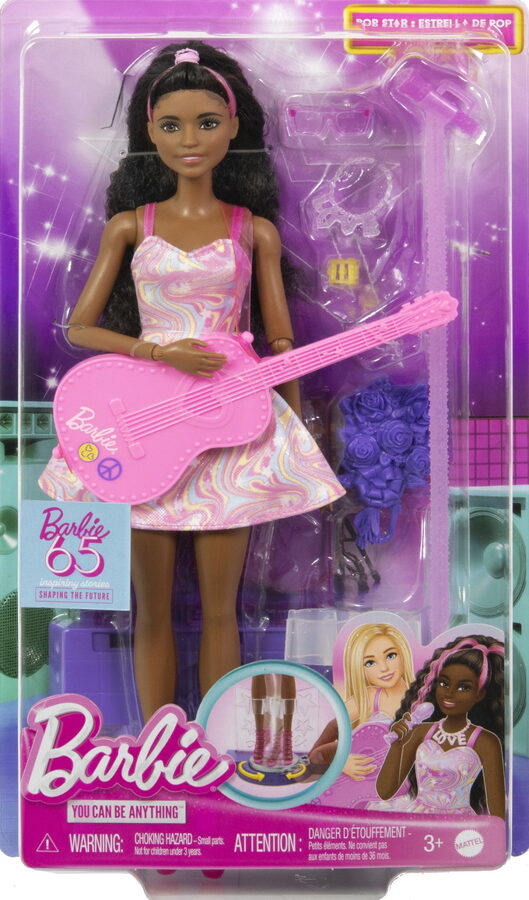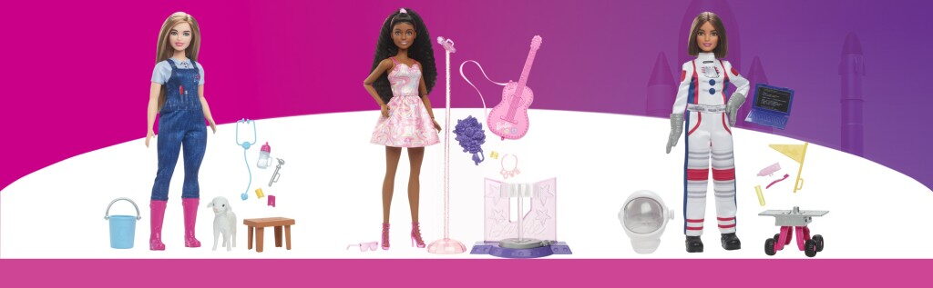 Oslavte 65. výročí panenky Barbie® společně s kolekcí panenek, které se věnují třem nejoblíbenějším povoláním: farmářce, popové hvězdě a astronautce. Každá panenka má na sobě profesionální oblečení a je vybavena 10 tematickými doplňky, z nichž jeden má i zábavnou pohybovou funkci! Prodávají se samostatně dle aktuální nabídky. Panenka neumí samostatně stát. Barvy a vzhled výrobku se mohou lišit.