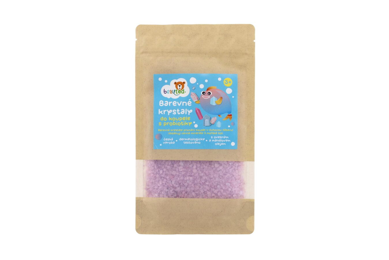 Barevné krystaly beauted šumí, barví vodu a zároveň pečují o jemnou dětskou pokožku. Obsahují probiotika podporující přirozenou ochranu pokožky. Obohaceny o minerály z mořské soli, ovesný extrakt a mandlový olej. Dermatologicky testováno – vhodné i pro citlivou dětskou pokožku. Český výrobek. Praktický uzavíratelný sáček pro snadné skladování a zachování čerstvosti. Barevné krystaly vytvoří ve vodě zábavný efekt a příjemnou vůni. Nasypte do teplé vody potřebné množství krystalů, sledujte jejich šumivý efekt a nechte se unést hravou atmosférou koupele.