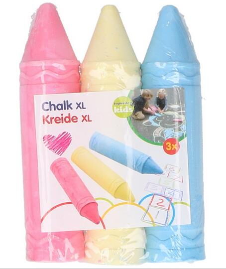 Barevné kulaté křídy pro kreslení na chodník. Jsou snadno smývatelné vodou a splňují veškeré evropské normy. Balení obsahuje tři kusy velkých kříd. Probuďte v dětech fantazii! Vhodné pro děti od 3 let. Délka 19 cm.