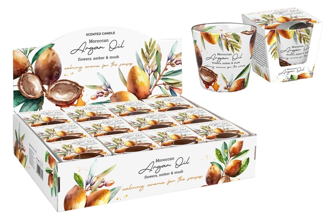 (BAL:12ks) Svíčka s vůní v kónickém skle, dekor arganový olej.Vůně marockého arganového oleje, svěžesti zelených listů, s nádechem růže a jasmínu, pro relaxaci a odpočinek.Baleno v papírové krabičce s průhledem. Pro večer plný klidu a pocitu bezpečí.Rozměr: průměr 9 x 8,5cm. Rozměr boxu: 39 x 28,5 x 9cm. Doba hoření: 30 hodin. Prodej po 12ks v boxu. Cena za jeden kus.