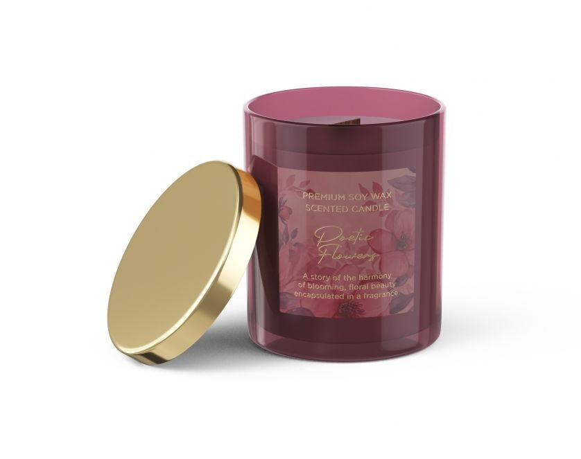 (BAL:12ks) Svíčka s vůní v kónickém skle, dekor poetické květy. Se sójovým voskem s dřevěným knotem. Vůně: s příběhem harmonie a květinové krásy zapouzdřené ve vůni. Balení: volně.Dekor: luxusní osobní, se zrcadlovým víčkem. Rozměr: 8 x 9cm. Rozměr boxu: 28,5 x 37 x 10cm. Doba hoření: 35 hodin. Prodej po 12ks v boxu. Cena za jeden kus.