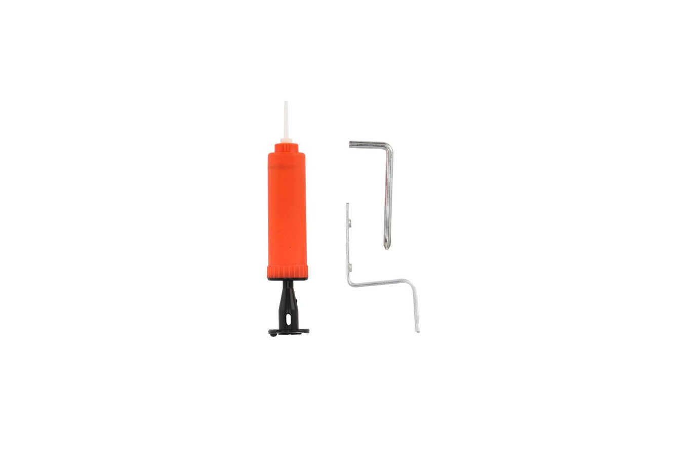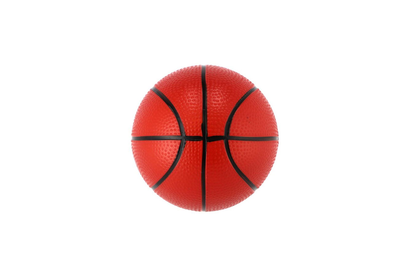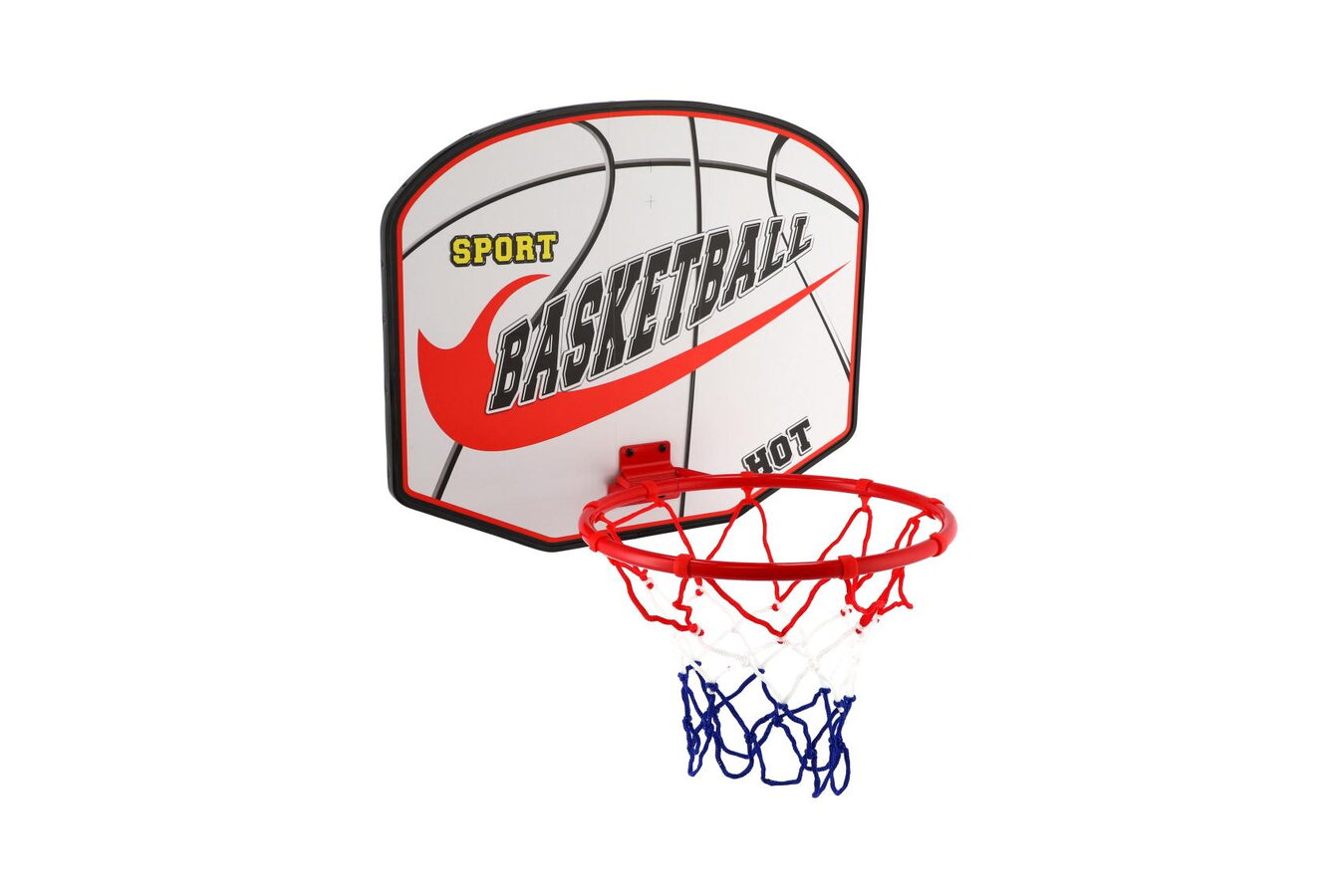 Basketbalový koš s dřevěnou deskou na pověšení, míč a pumpička na nafouknutí míče.