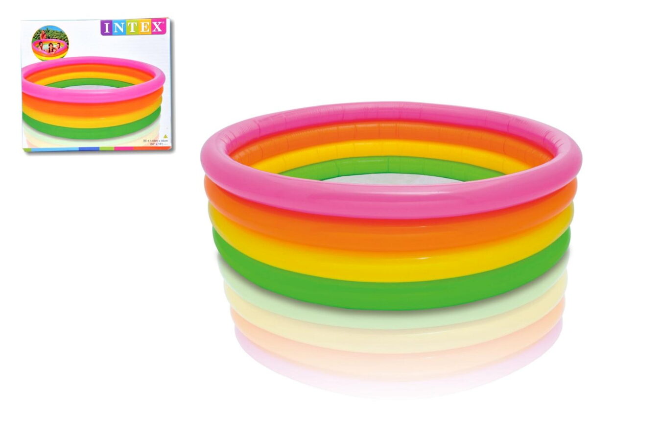 INTEX 56441 - Dětský kulatý duhový nafukovací bazén Sunset Glow. Pestře barevný čtyřkruhový bazén pro děti na zahradu. Kapacita vody: 617 l (75% naplnění) při výšce vody 37cm.