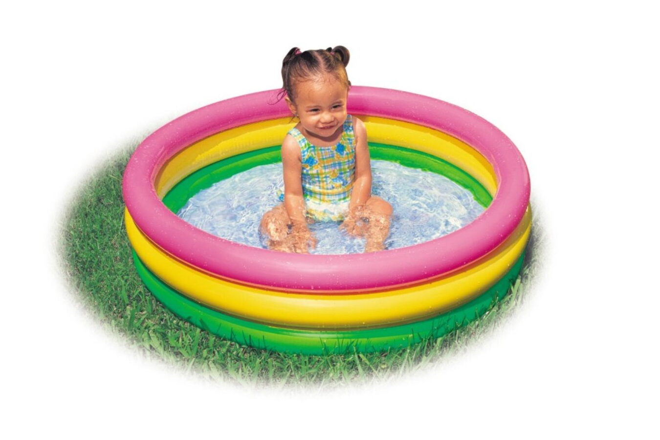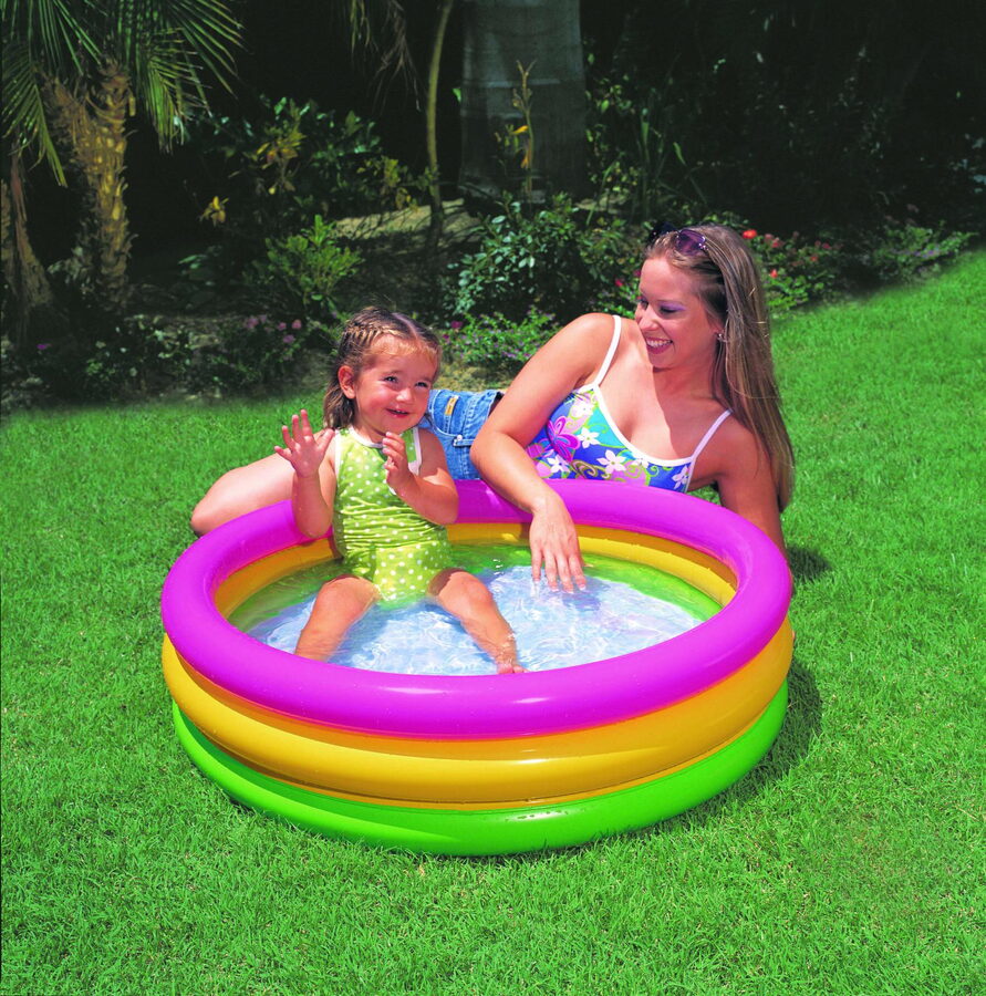 Barevný tříkomorový nafukovací bazének přemění každou zahrádku na malé koupaliště.