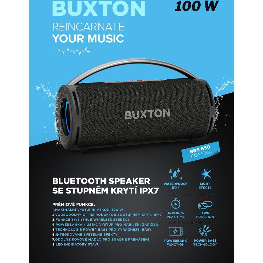 Další level zábavy s přáteli či rodinou vám zpřístupní BT reproduktor Buxton BBS 650 FOXHILL. Čistý zvuk, zvýrazněné basy díky technologii Power Bass a maximální výstupní výkon 100 W se postarají o pořádnou párty, kterou si plně vychutnáte. S dosahem Bluetooth připojení až 15 m můžete streamovat hudbu odkudkoli.