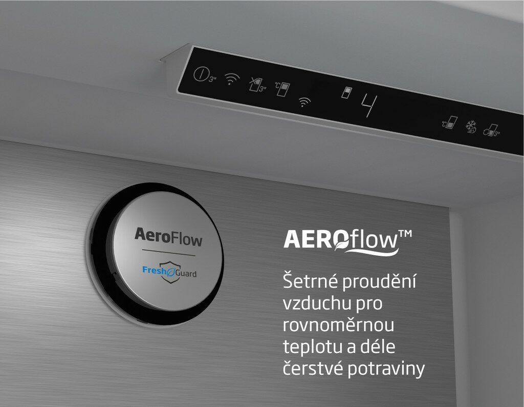 Zaručuje optimální cirkulaci chladného vzduchu v celém prostoru lednice pro uchování déle čerstvých potravin. Vzduch AeroFlow se v lednici distribuuje rovnoměrně, a tak se teplota mezi policemi nijak neliší. Navíc vzduch nefouká přímo na potraviny, aby neosychaly.