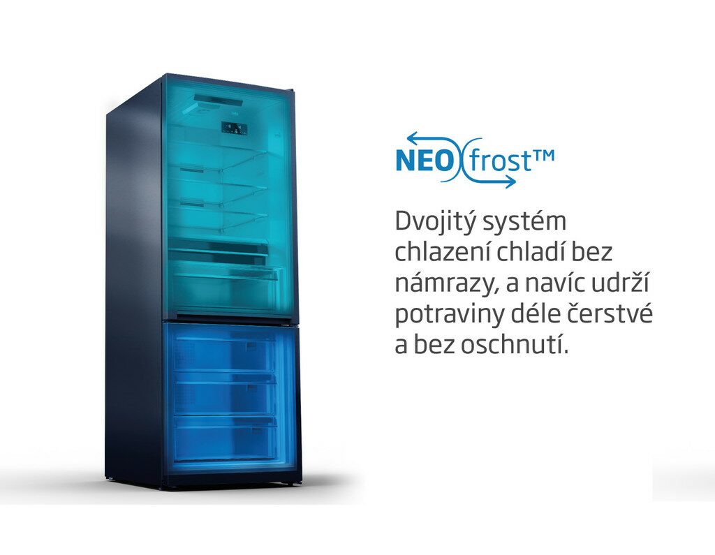 Chladnička je vybavena technologií NeoFrost™, neboli dvěma oddělenými chladicími okruhy. Ty zajišťují, že se nebude míchat vzduch mezi lednicí a mrazákem. Potraviny si udrží delší čerstvost a pachy se nebudou míchat. Také díky této technologii nemusíte strávit hodiny odmrazováním chladničky ani mrazáku.