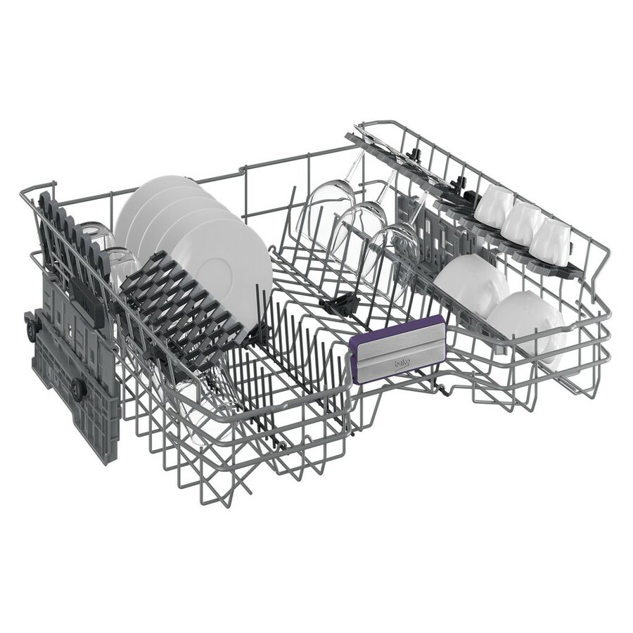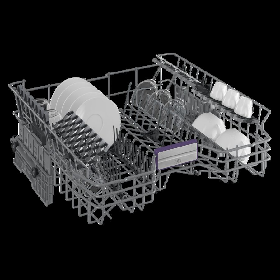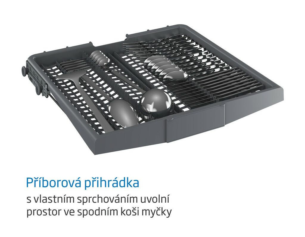 Příborová přihrádka poskytuje dostatek prostoru pro rozložení příborů a drobného nádobí a je vybavená i vlastním sprchováním. Díky příhrádce se tak ve spodním koši uvolní další místo pro velké kusy nádobí.