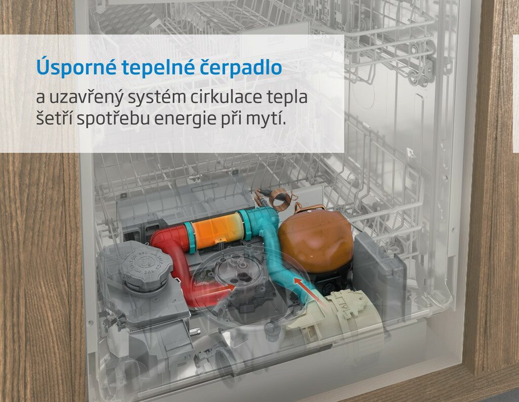 Úsporné tepelné čerpadlo a uzavřený systém cirkulace tepla šetří energii, protože se teplo nevytváří neustále znovu a během mytí tolik neuniká.