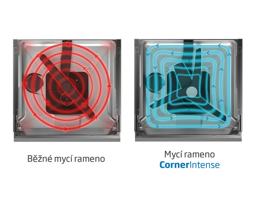 Rameno CornerIntense™ dosáhne až do rohů myčky. Díky tomu je nádobí umyté, ať jej dáte ve spodním koši kamkoliv.