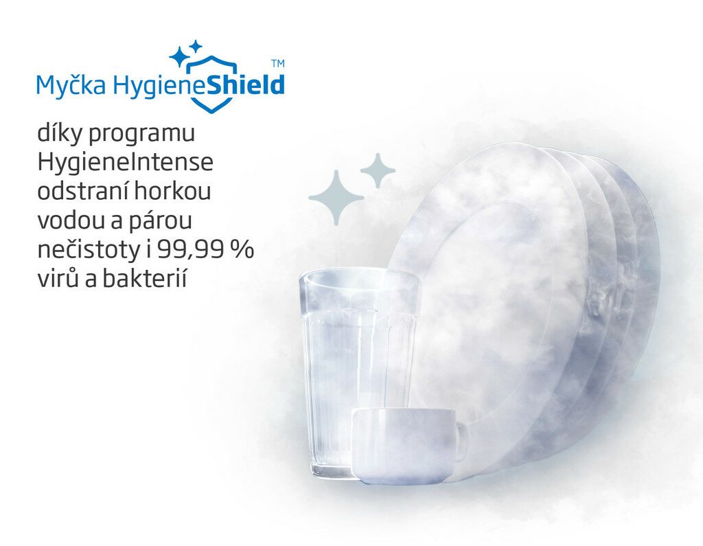 Program HygieneIntense umí horkou vodou a párou odstranit nečistoty i 99,99 % virů a bakterií. V jednom kroku tak nádobí umyje, vydezinfikuje a zanechá ho hygienicky čisté.