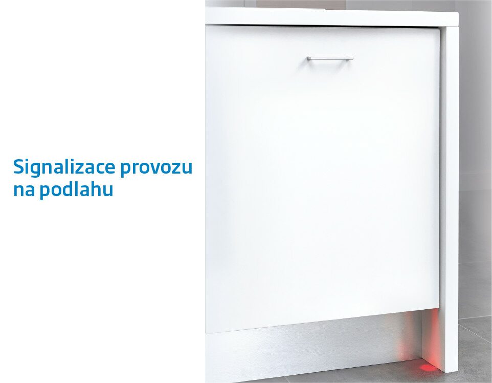 LED signalizace provozu na podlahu vám elegantně řekně, kdy myčku neotevírat, a přitom neruší jednotný design kuchyňské linky.