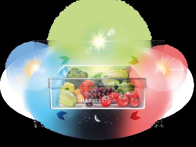 Speciální světelný režim přihrádky HarvestFresh™ kopíruje střídání světla a tmy během celého dne. To udrží v chodu přirozené procesy v ovoci a zelenině, takže se uchová více vitamínů i chuti, než kdyby byly jen zavřené ve tmě. Díky tomu není potřeba každý den nakupovat a zdravá svačinka je stále při ruce.