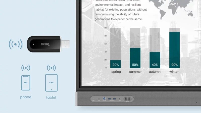 Připojte adaptér k displeji BenQ a nastavte Wi-Fi hotspot za účelem sdílení ethernetového připojení s více zařízeními. Toto řešení je ideální pro zasedací místnosti, kde je zapotřebí bezdrátové sdílení obrazovky.