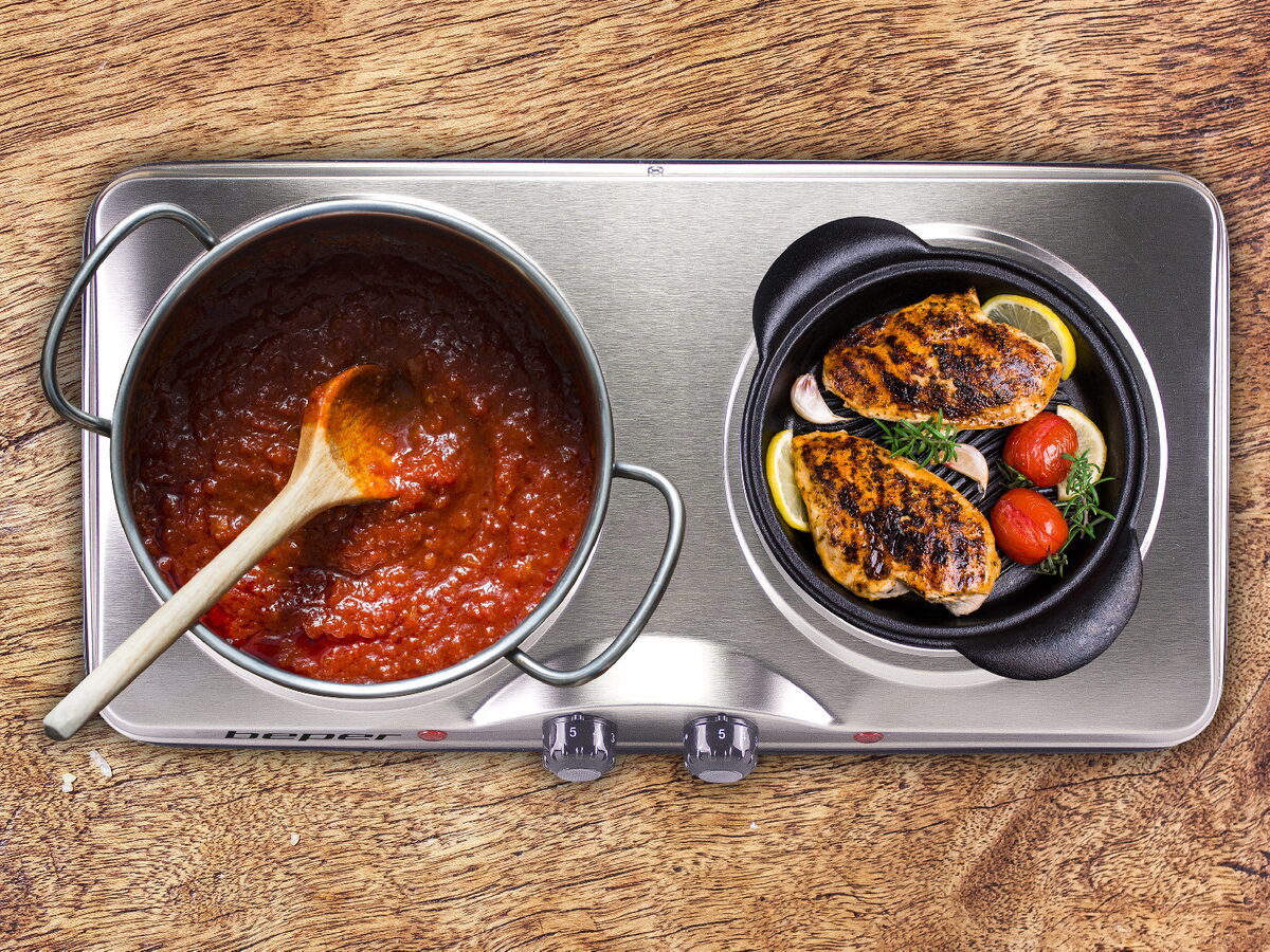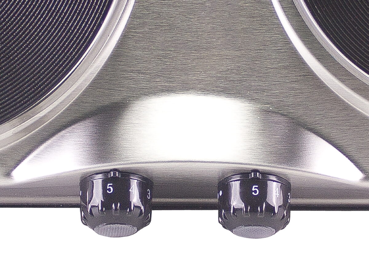 Elektrický dvouplotýnkový vařič s plynule regulovatelným termostatem a světelnou kontrolkou. V moderním designu s unikátní chromovanou úpravou povrchu, díky které se desky snadno čistí a upravují.