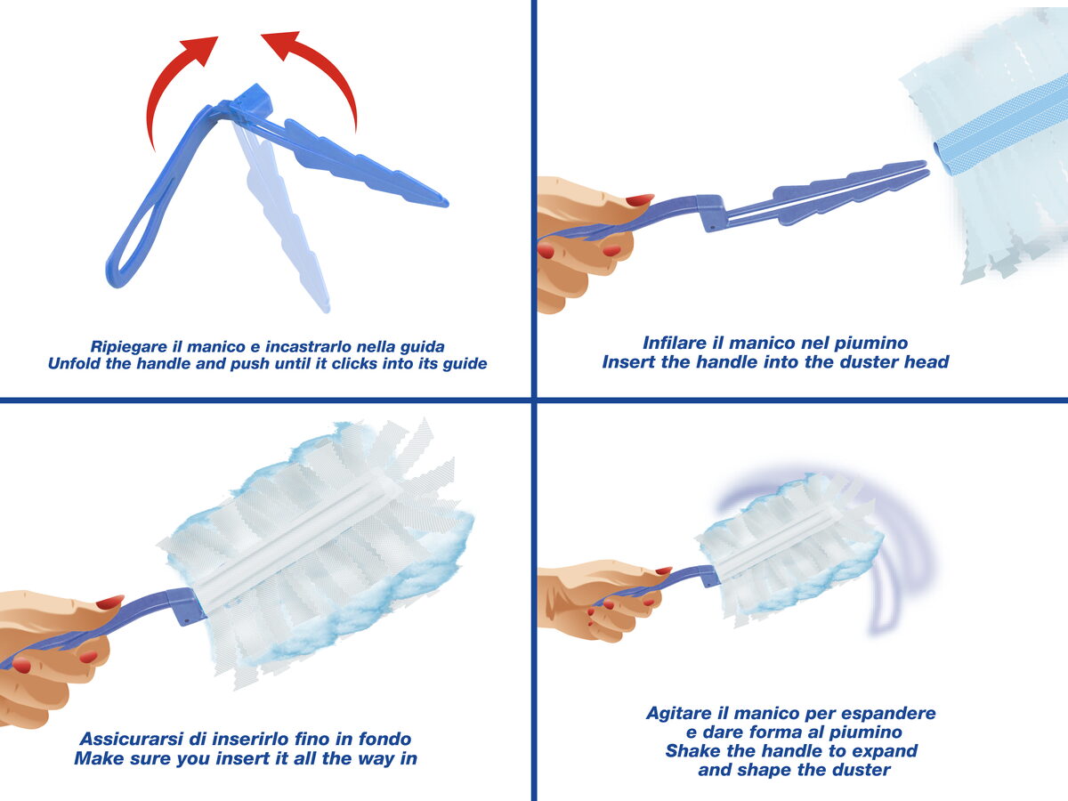 Rozložte rukojeť a zatlačte na ni, dokud nezapadne do svého vodítka. Vložte rukojeť do hlavice prachovky. Ujistěte se, že jste prachovku zasunuli až na doraz. Zatřeste násadou, aby se prachovka roztáhla a vytvarovala.
