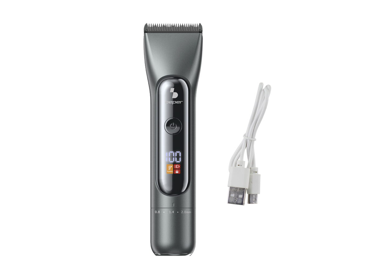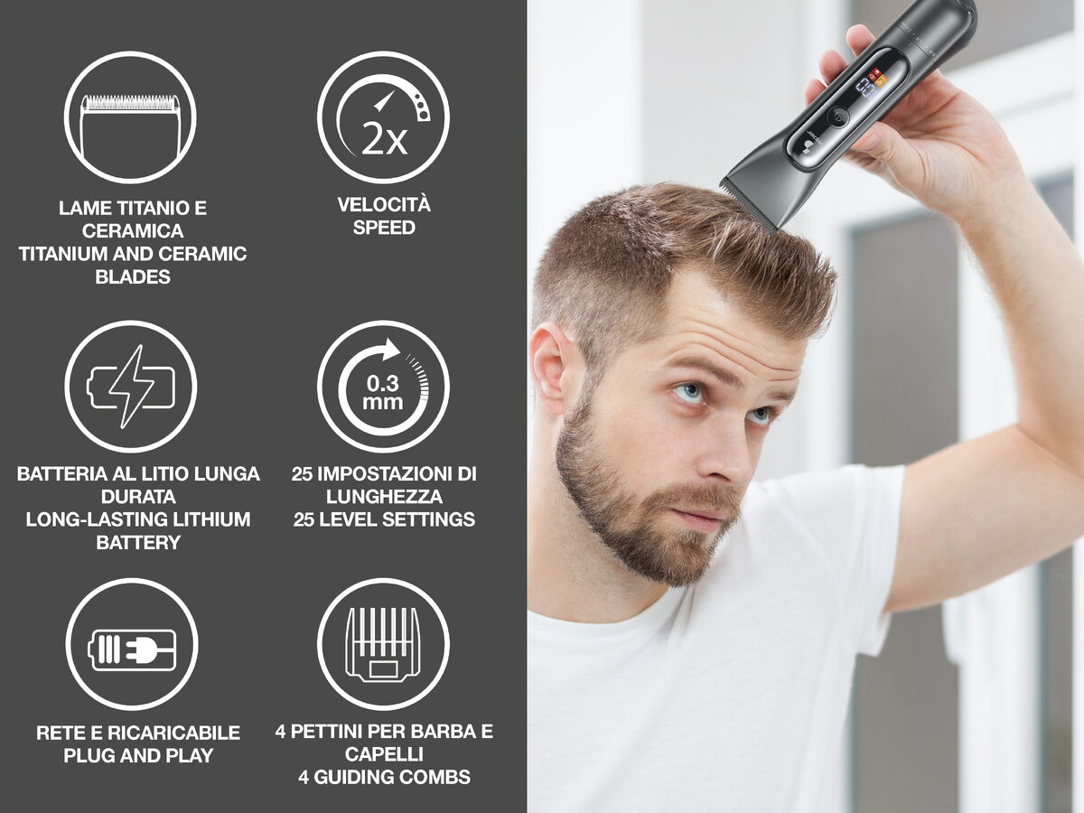O precizní a hladký střih se starají pevné ocelové břity s titanovým povrchem a pohyblivé keramické břity. Přehledný LED displej zobrazuje stav baterie, zvolenou rychlost a stav zámku proti nechtěnému zapnutí.