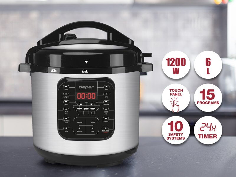 Jeho 15 přednastavených programů nabízí širokou škálu alternativ od předkrmů, hlavních jídel, příloh až po dezerty. Perfektně nadýchaná rýže v páře, pomalu vařený guláš, jehněčí kýta pod tlakem... ať už chcete v kuchyni připravit jakýkoli lahodný recept, multifunkční hrnec BEPER zéměř nezná hranic. Nádoba o objemu 6 litrů z níž nakrmíte celou rodinu.