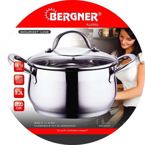 -Indukční nádobí Bergner-materiál: nerezová ocel 18/10, tloušťka 0,6 mm-stříbrná barva-celonerezové držadla-rozměry: průměr 20 x 11,5 cm, objem 3,3 L-sendvičové dno-skleněná poklice