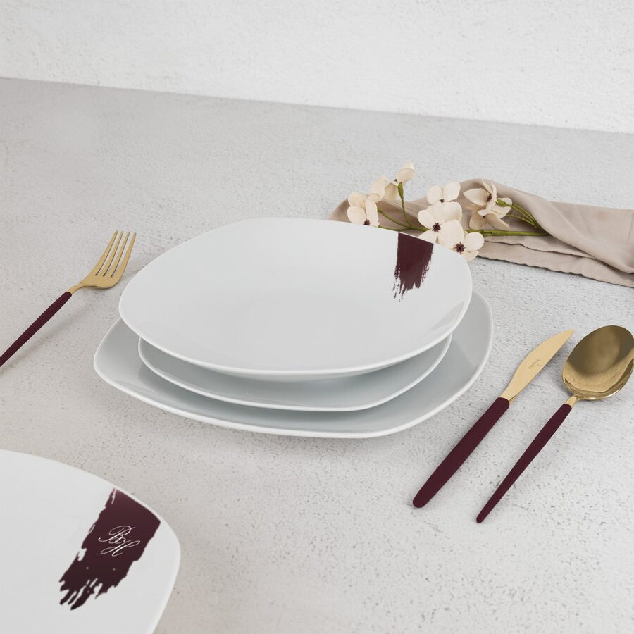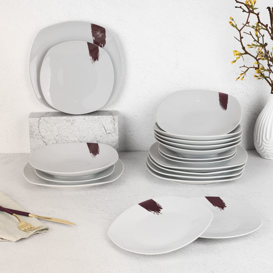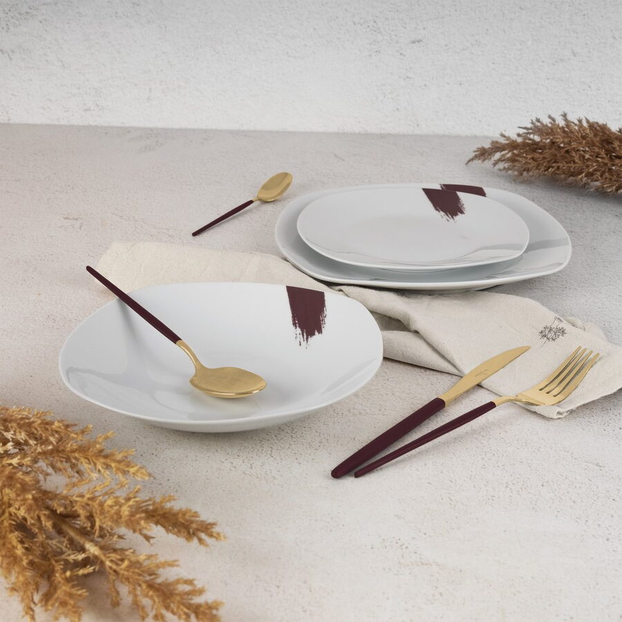 Jídelní sada talířů – 18 ks, prémiový porcelán, bílo-bordó Jednoduchost, která vynikne