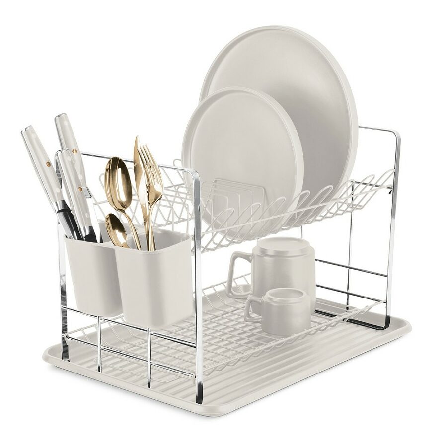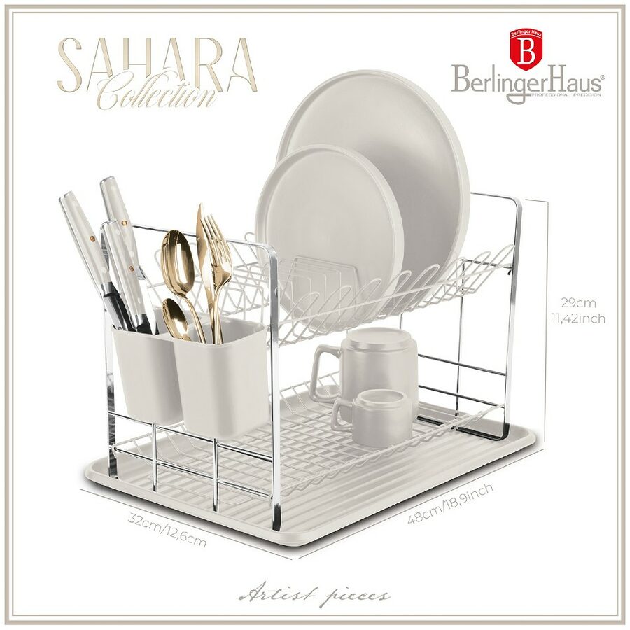 Dvoupatrový odkapávač na nádobí z kolekce Sahara od BerlingerHaus. Odnímatelný odkapávací tác. Dvě patra pro nádobí či skleničky a dva zásobníky na příbory a náčiní. Jednoduchá údržba a čištění. Designový kousek vyrobený v kombinaci plastu a kovu. Rozměry 48 x 32 x 29 cm